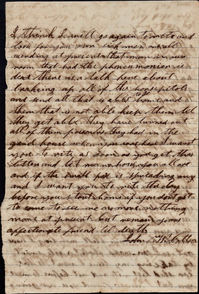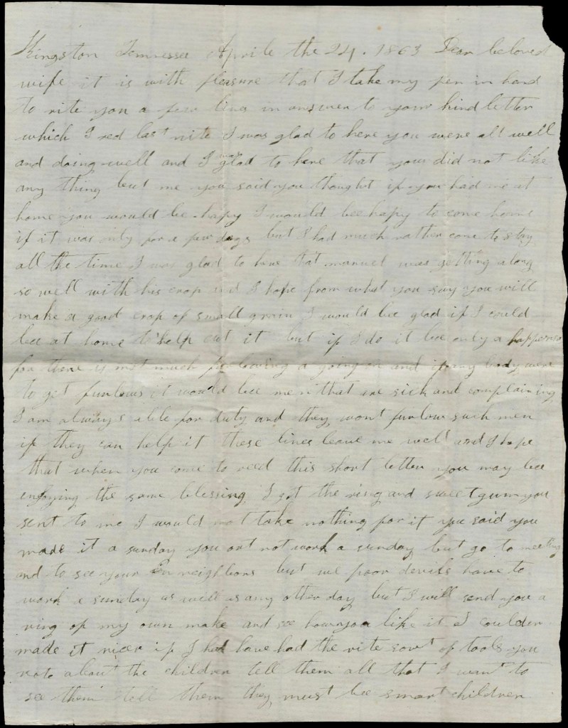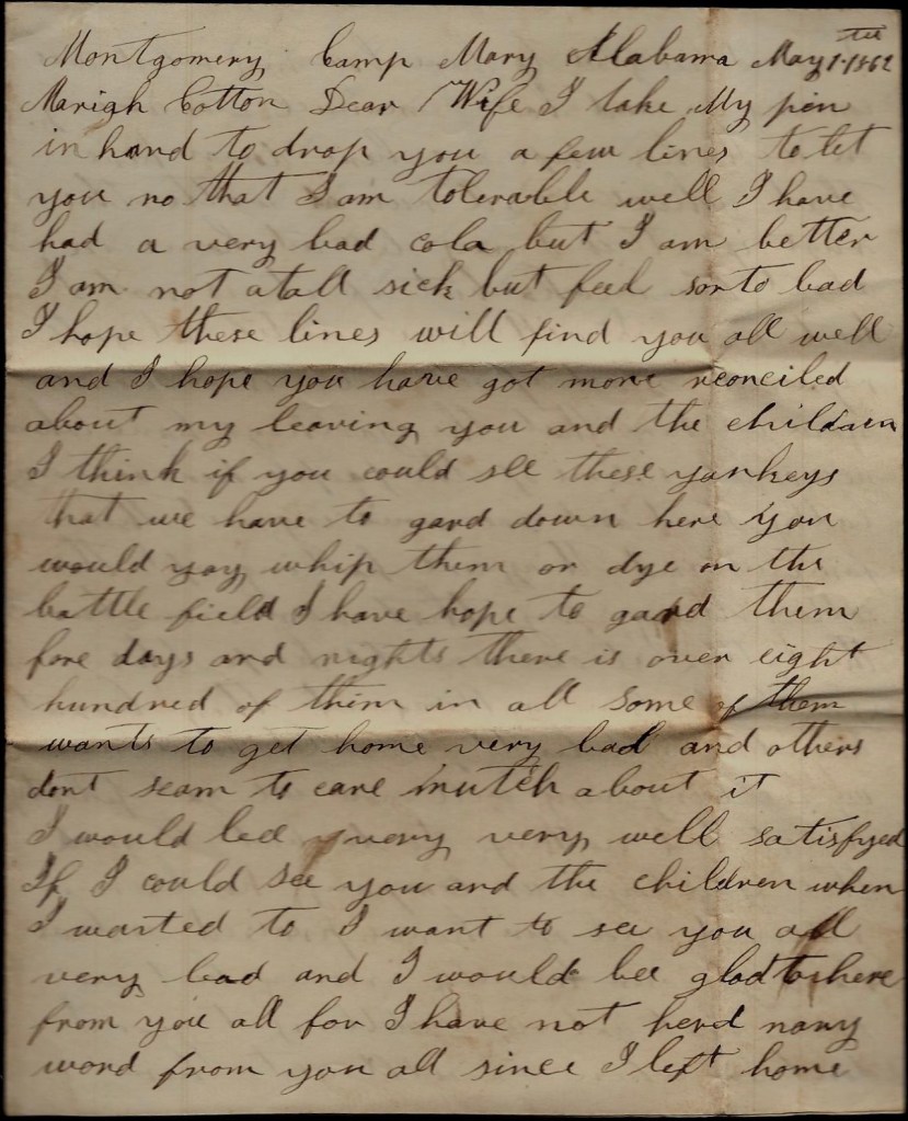 I take my pen in hand to drop you a few lines to let you know that I am tolerable well. I have had a very bad cold but I am better. I am not at all sick but feel sorta bad. I hope these lines find you all well and I hope you have got more reconciled about my leaving you and the children. I think if you could see the Yankeys that we have to guard down here, you would say, “whip them or die on the battlefield.” I have had to guard them four days and nights. There is over eight hundred of them in all. Some of them wants to get home very bad and others don’t seem to care much about it. I would be very well satisfied if I could see you and the children when I wanted to. I want to see you all very bad and I would be glad to hear from you all for I have not heard nary word from you since I left home. I would be glad to hear how my wheat was coming on and how [our hired slave] Manuel 1 was coming on with his crop. We hear down here that wheat is all ruined with the rust [blight]. If it is, I may be home in about two weeks but if it is not, I don’t guess I will come until it gets ripe. The most of our men is at home now.