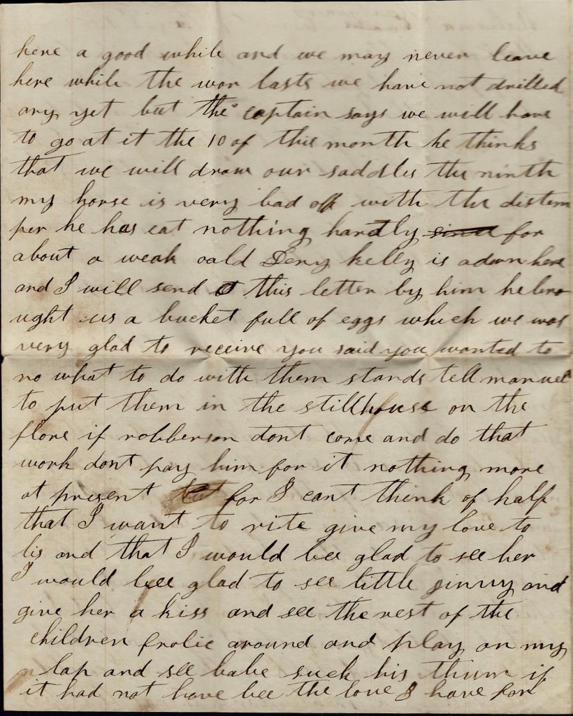 Mariah, you said you wanted to know about our going to Talladega to drill. I have not heard nothing about it since we got down here—only our Colonel says that we may have our first battle here at this place. I expect we will stay here a good while and we may never leave here while the war lasts. We have not drilled any yet but the Captain says we will have to go at it the 10 of this month. He thinks that we will draw our saddles the ninth. My horse is very bad off with the distemper. He has eat nothing hardly for about a week. Old Denny Kelly is down here and he brought us a basket full of eggs which we was very glad to receive.