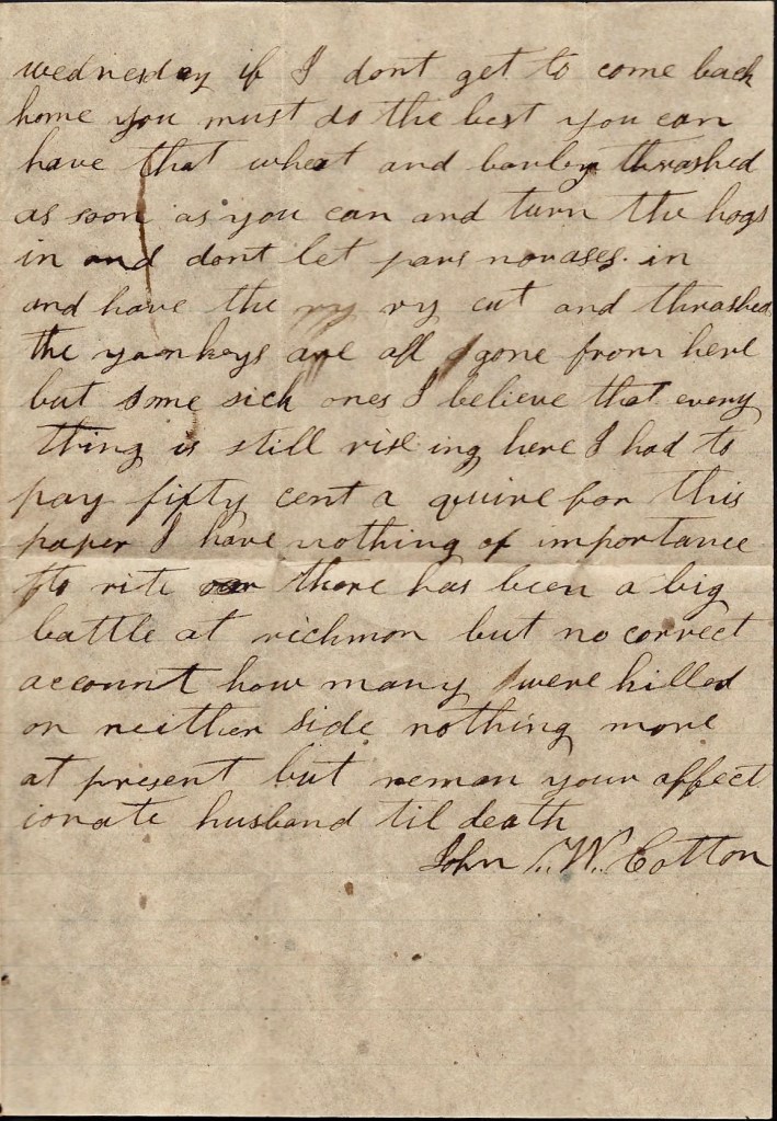 The Yankeys are all gone from here but some sick ones. I believe that everything is still rising here. I had to pay fifty cents a quire for this paper. I have nothing of importance to write. There has been a big battle at Richmond [Battle of Seven Pines] but no correct account [of] how many were killed on either side. Nothing more at present but remain your affectionate husband till death, — John W. Cotton
