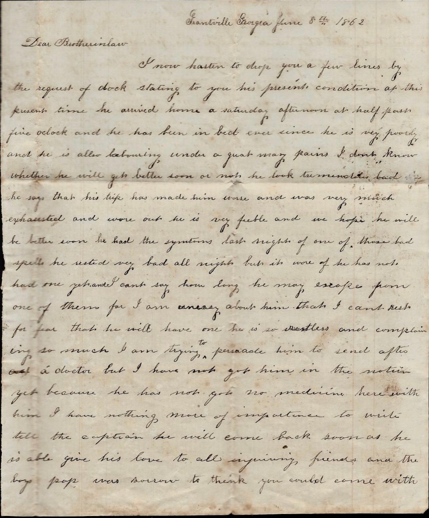 I now hasten to drop you a few lines by the request of Dock stating to you his present condition at this time. He arrived home a Saturday afternoon at half past five o’clock and he has been in bed ever since. He is very poorly and he is also laboring under a great many pains. I don’t know whether he will get better soon or not. He looked tremendously bad and he says that his trip has made him worse and was very much exhausted and wore out. He is very feeble and we hope he will be better soon. He has the symptoms last night of one of those bad spells. He rested very bad all night but it wore off. He has not had one yet and I can’t say how long he may escape from one of them for I am [so] uneasy about him that I can’t rest for fear that he will have one. He is so restless and complaining so much. I am trying to persuade him to send after a doctor but I have not got him in the notion yet because he has not got no medicine here with him.