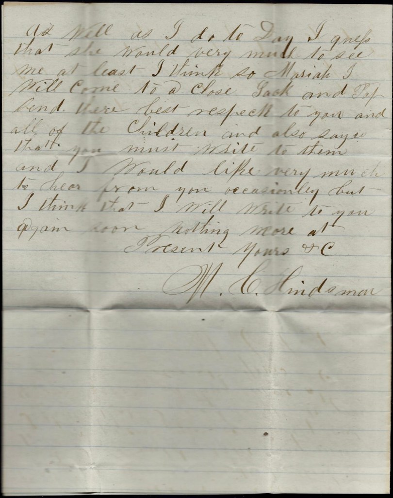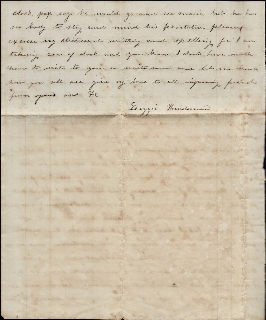 Please excuse my distressed writing and spelling for I am taking care of Dock and you know I don’t have much chance to write to you. So write soon and let me know how you all are. Give my love to all enquiring friends. From yours and &c. — Lizzie Hindsman