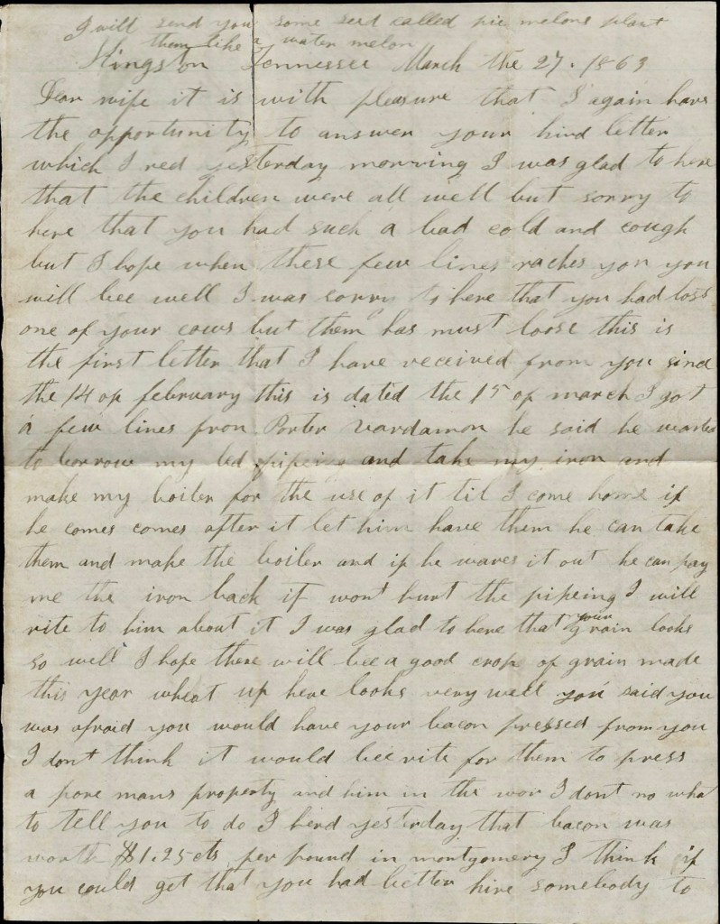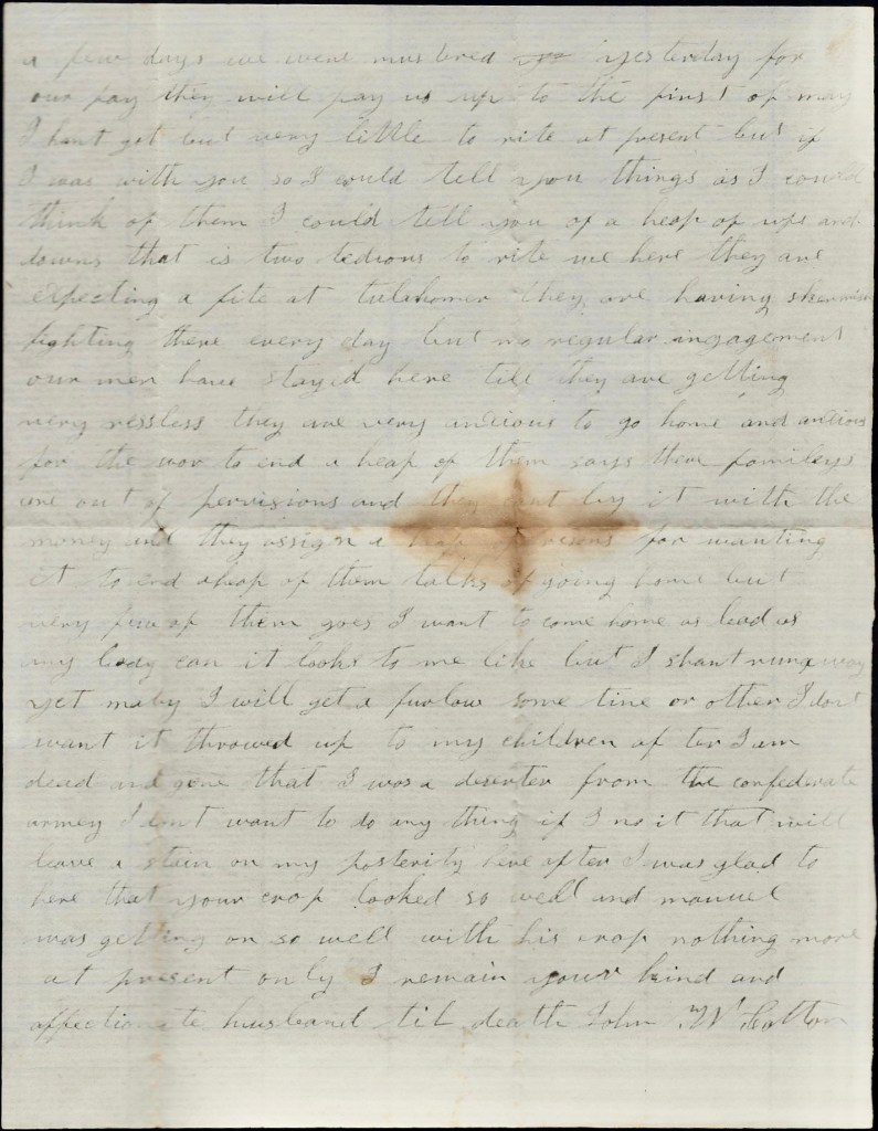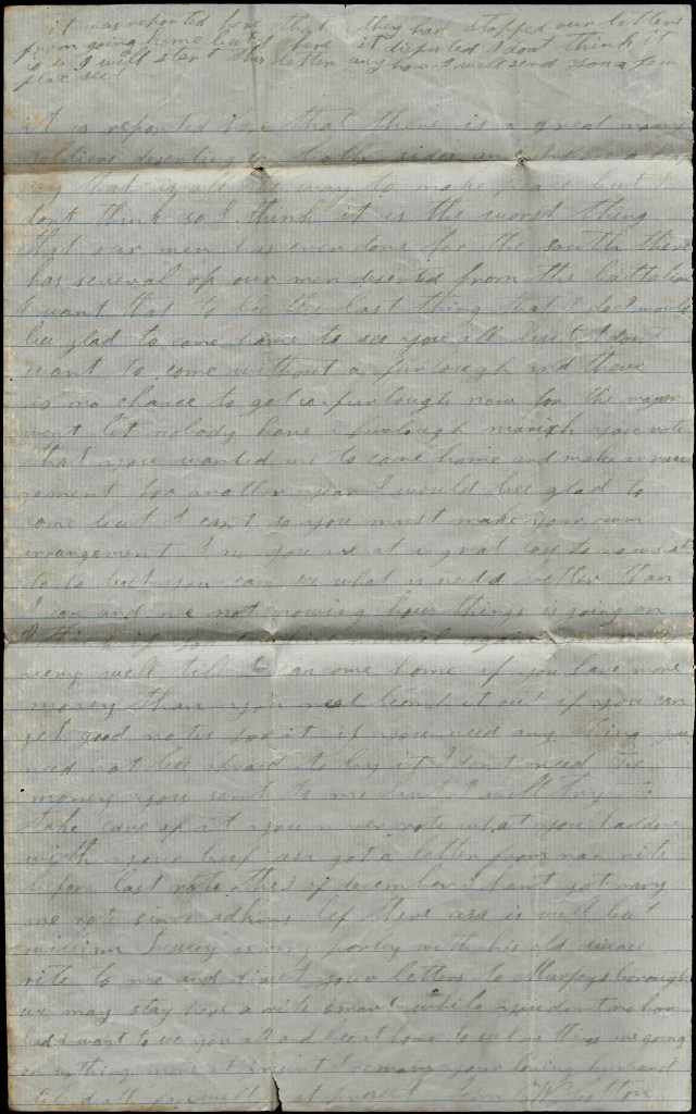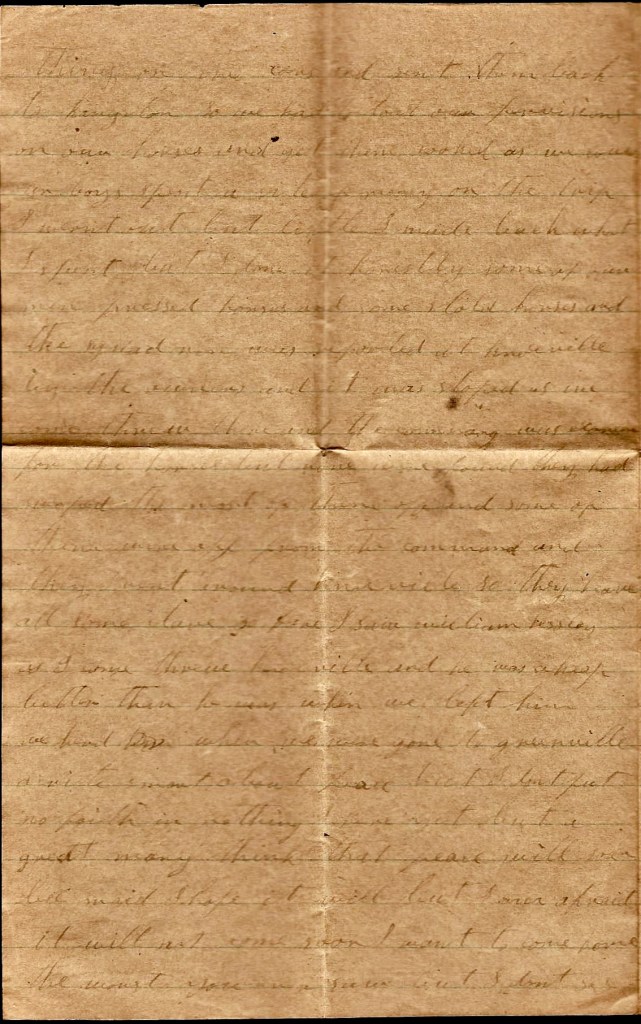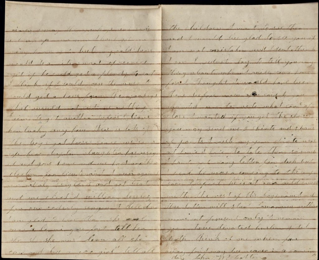 You said you wanted me to tell you what to do with your money. I don’t know what to tell you. If you can lend it out and get good notes for it, it would be the best thing you could do, but I don’t reckon there is anybody that wants to borrow. If you can’t lend it, if you can find anything you want you can buy it. I wish I could come home and stay a few days till I could see how things were going on but I had rather come to stay…But there is one thing that gives me great consolation—you have a plenty to live upon and from what I learn, there is lots of soldier’s wives that has not much to eat. If I were to hear that you had nothing to eat, I should come home at the risk of my life…