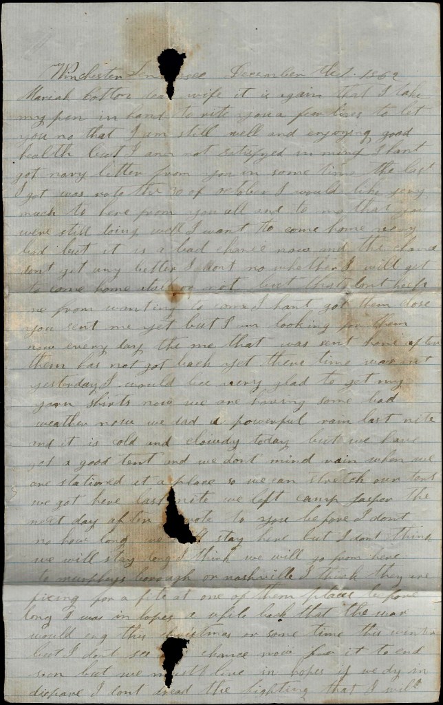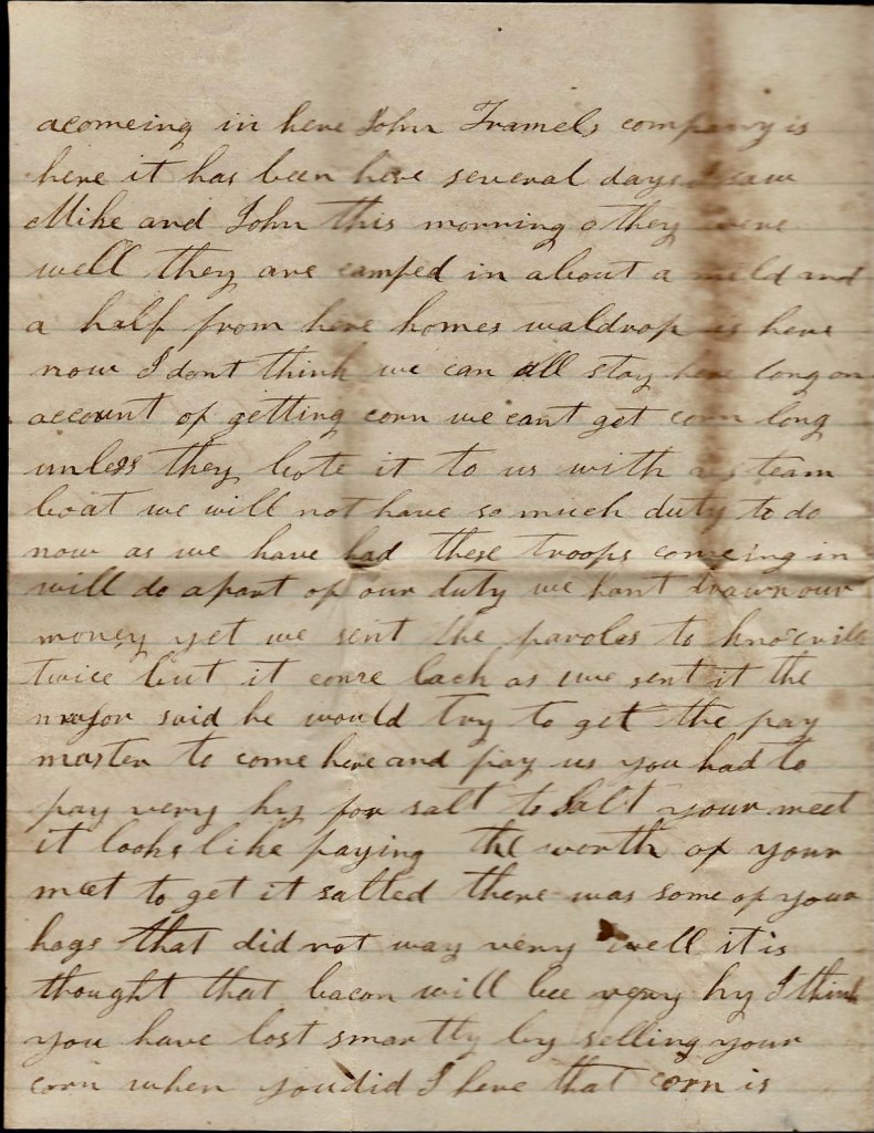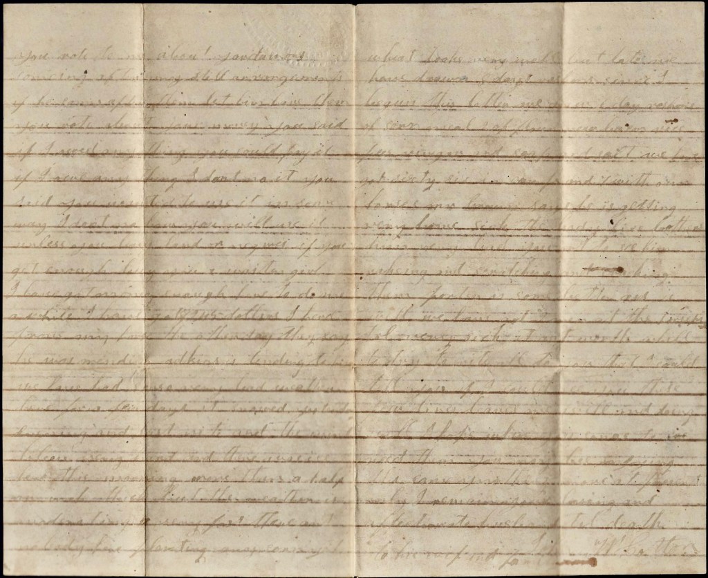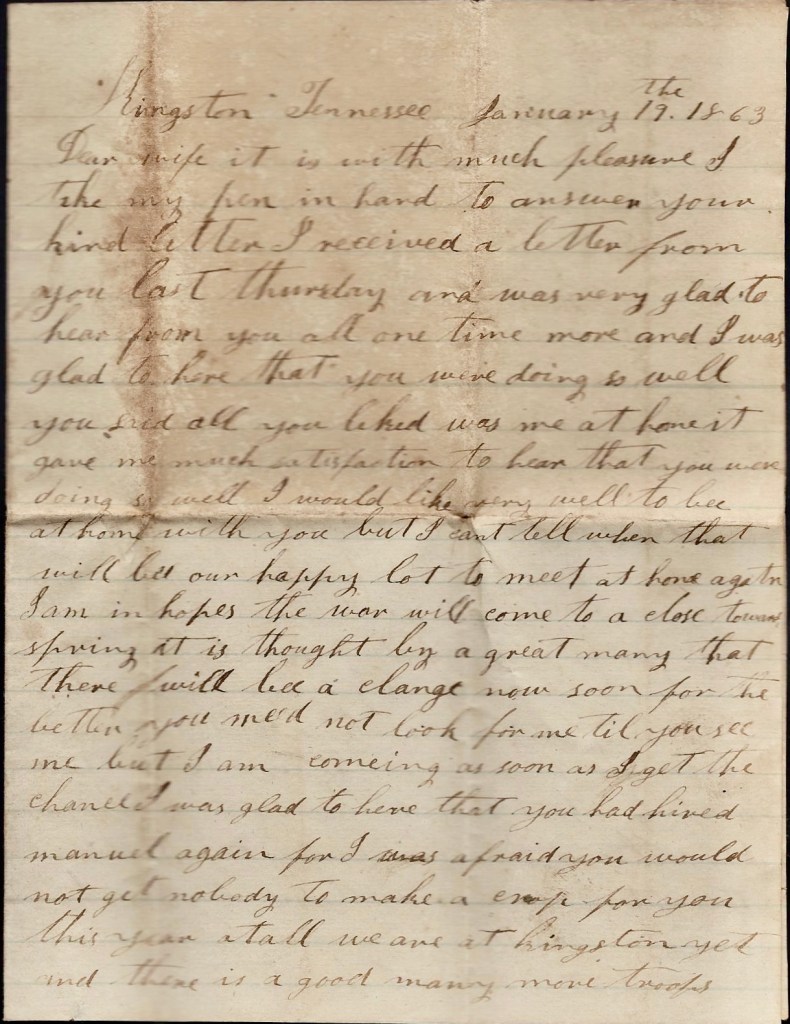 You said you wanted me to tell you what to do with your money. I don’t know what to tell you. If you can lend it out and get good notes for it, it would be the best thing you could do, but I don’t reckon there is anybody that wants to borrow. If you can’t lend it, if you can find anything you want you can buy it. I wish I could come home and stay a few days till I could see how things were going on but I had rather come to stay…But there is one thing that gives me great consolation—you have a plenty to live upon and from what I learn, there is lots of soldier’s wives that has not much to eat. If I were to hear that you had nothing to eat, I should come home at the risk of my life…