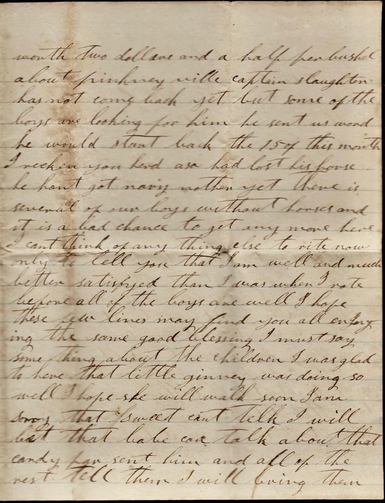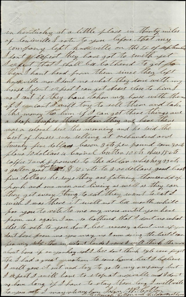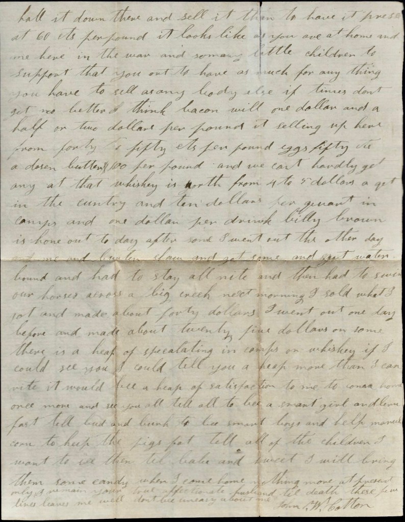 Billy Brown is sick. He is at the hospital. He looks tolerable bad. It is cold that ails him. There is heap of our company sick and complaining. Floyd Goodgame is very bad off yet. Porter is better off now than he has been since he came back from Kentucky. Asa is well and so is all of our mess. Our horses is at the convalescent camp yet and I expect Adkins has sold my horse. He said he could get $80 for him and I told him to sell him. [He] ain’t no account. I will have to buy me another horse anyhow. Porter has got to buy him a horse too. There is a heap of boys afoot and there ain’t no horses about here to buy and they are higher than ever. I saw horses and everything else is higher than I ever saw. It looks like men don’t care anything about money/ We bought two old hens this morning and paid two dollars for them. And butter is worth one dollar per pound and eggs he same per dozen. Nothing more at present, only I remain your dear, beloved husband till death, — John W. Cotton