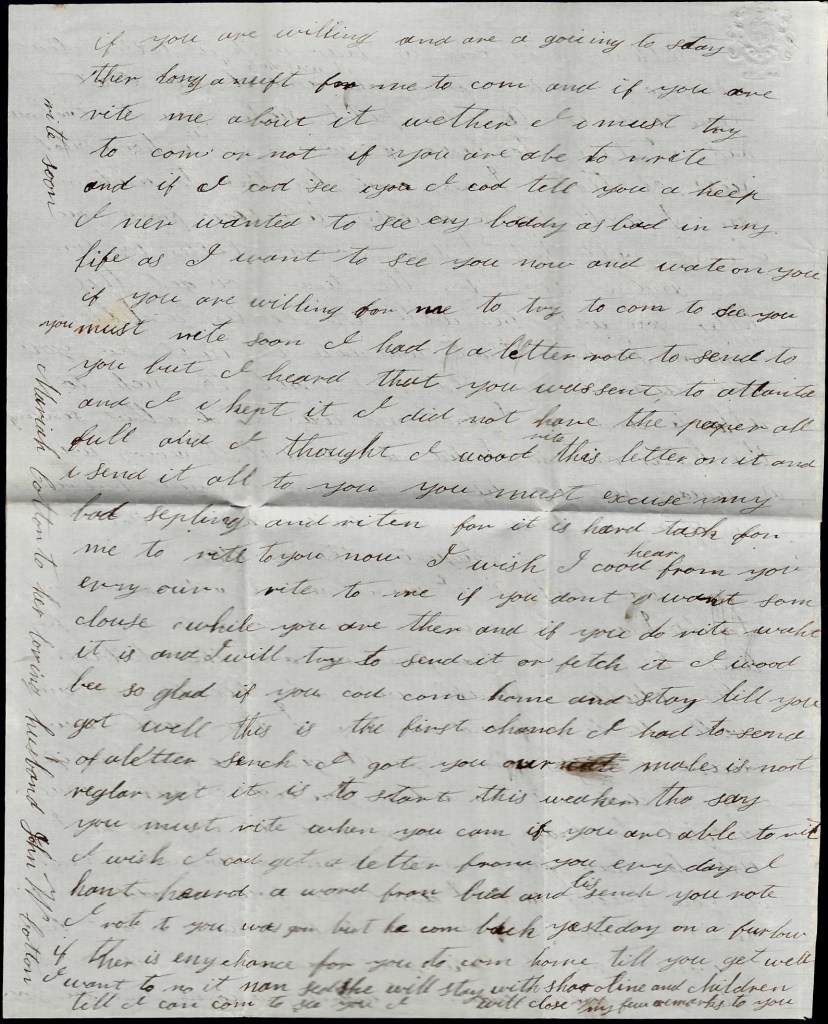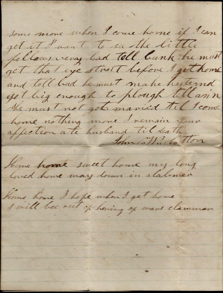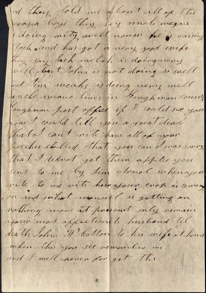 Crops look only tolerable well. There ain’t much cotton planted out here. Your pap and all of them was very glad to see me but none of them weren’t looking for me. I hant much to write to you. Nothing more at present but remain your affectionate husband till death, — John W. Cotton