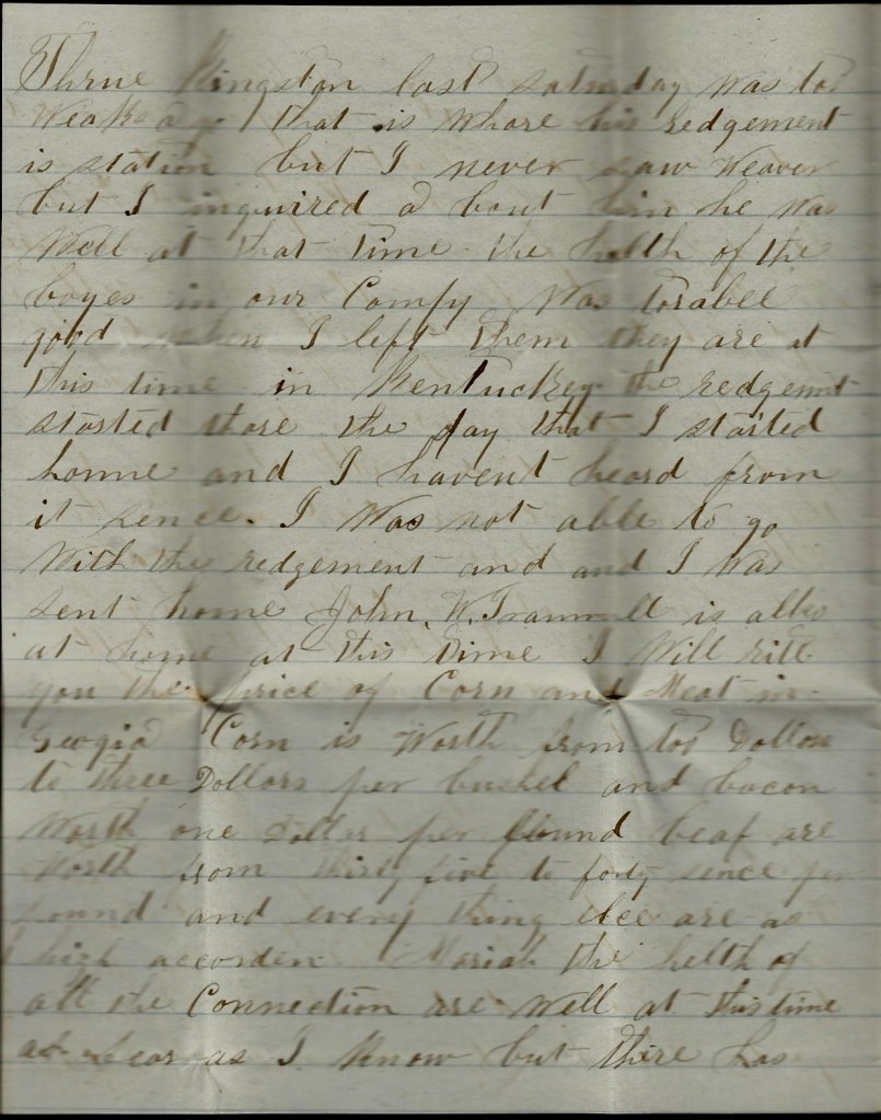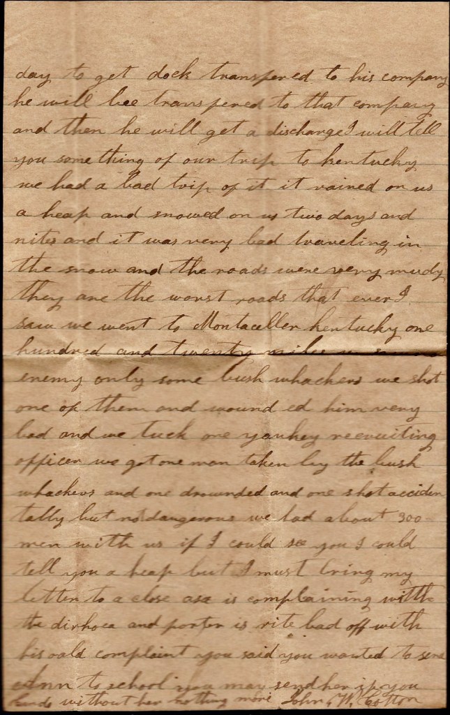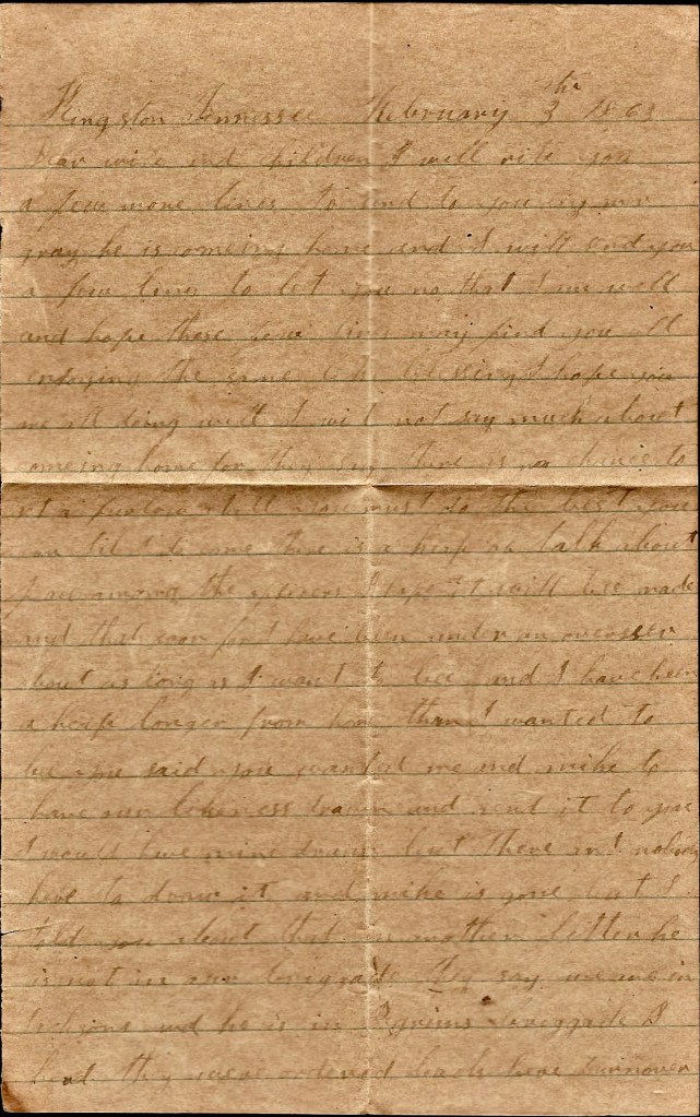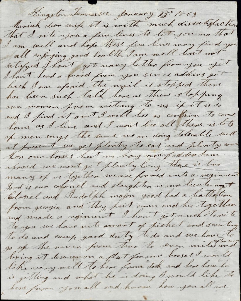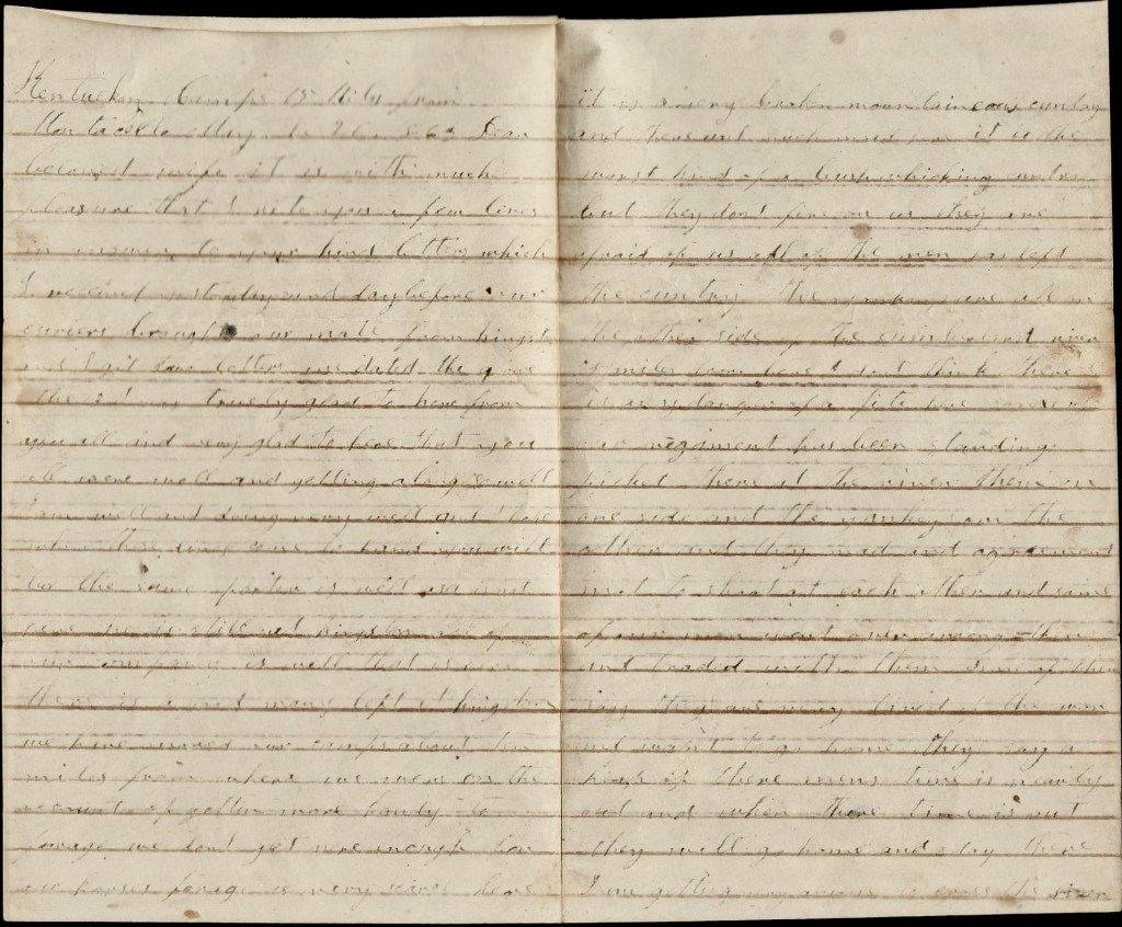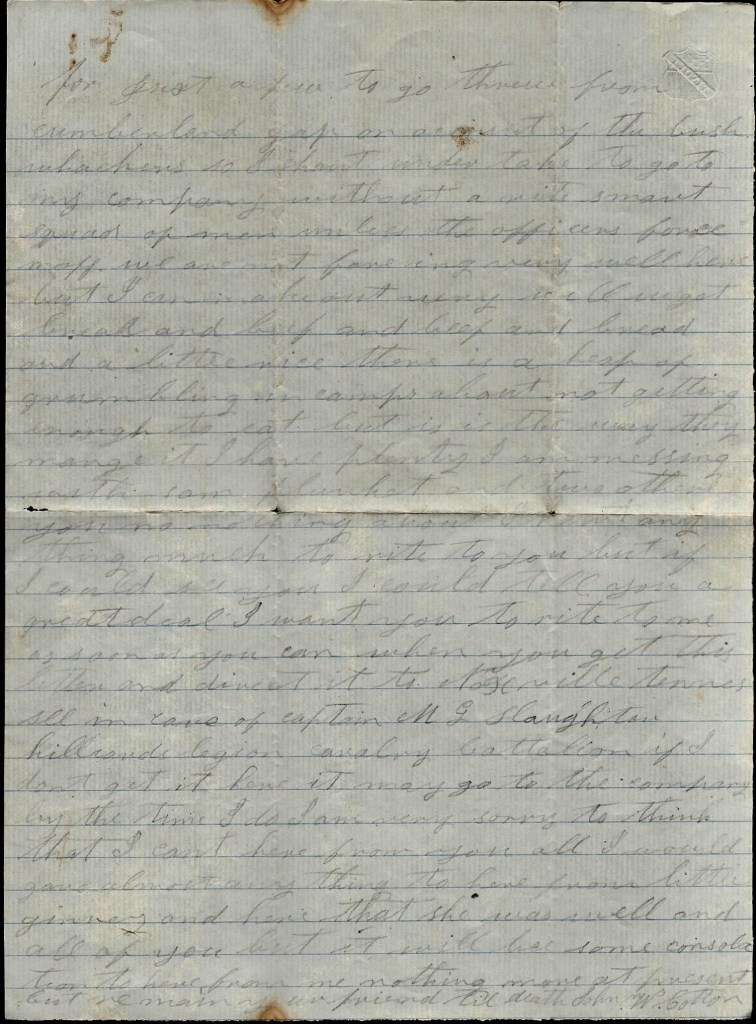 All of our men that were afoot is with a brigade of infantry. Asa went with us. He is left at Kingston as a courier. There ain’t no use in talking about coming home now but if I live to get out of Kentucky, I think I will come home. Don’t be uneasy about me for I ain’t in any danger yet. You may still write to Kingston. They say they are going to try to get the mail every week. A courier leaves here now directly to take our letters to Kingston.