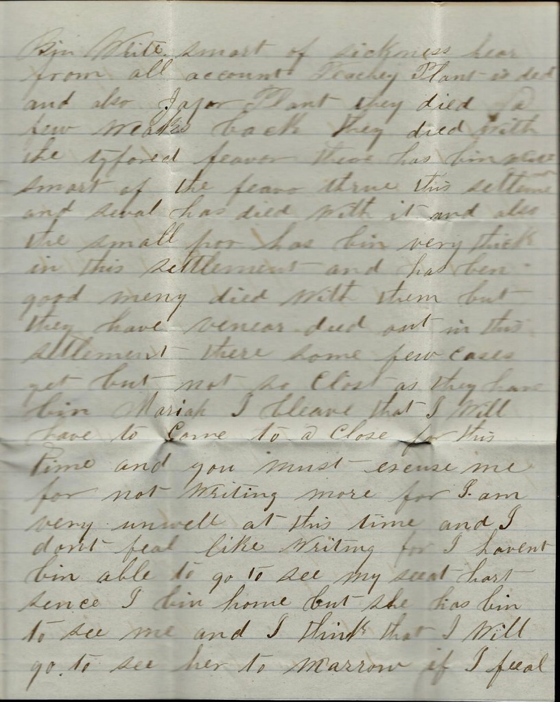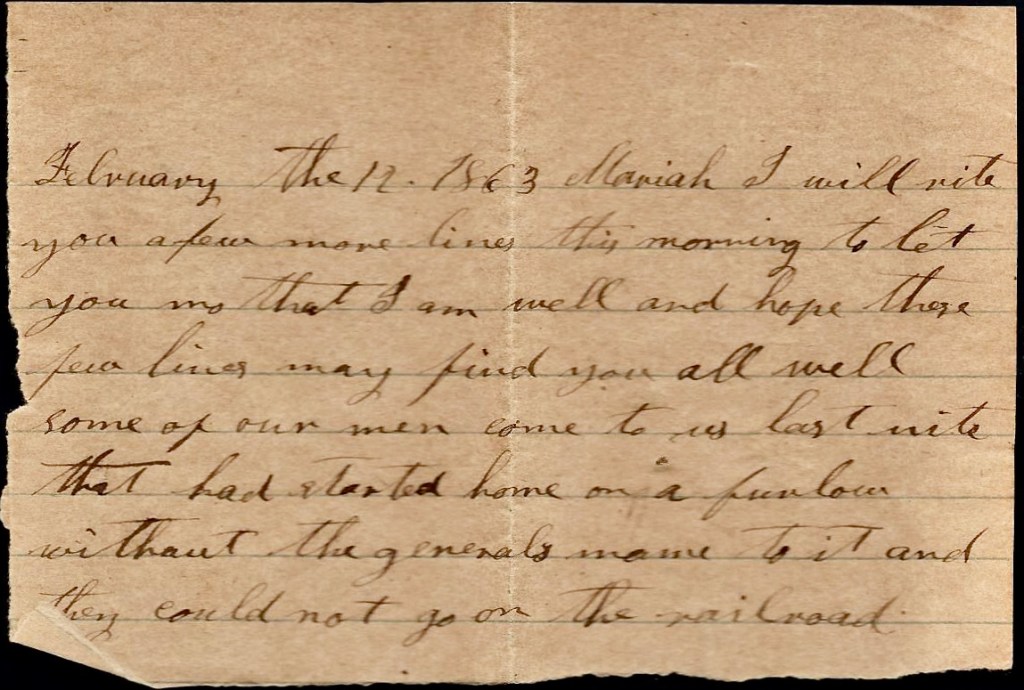 Mariah, I hant sent off my letter yet. I think it will start in the morning by courier. I hant had nary letter from you in some time but I look for one by the next mail. I want to hear from you all very much and I want to come home very bad and I think I will come home when I get back to Kingston. If they don’t give me a furlough, I will come without one, but I think there will be a chance for a furlough.