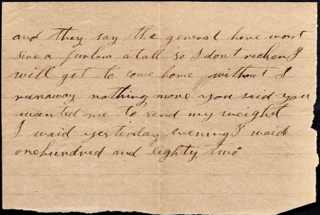 It is with pleasure that I take my pen in hand to write you a few lines in answer to your kind letter which I read last night. I was glad to hear you were all well and doing well…I was glad to hear that Manuel was getting along so well with his crop and I hope from what you say you will make a good crop of small grain. I would be glad if I could be at home to help cut it…If anybody were to get furloughs it would be men that are sick and complaining. I am always able for duty and they won’t furlough such men if they can help it.