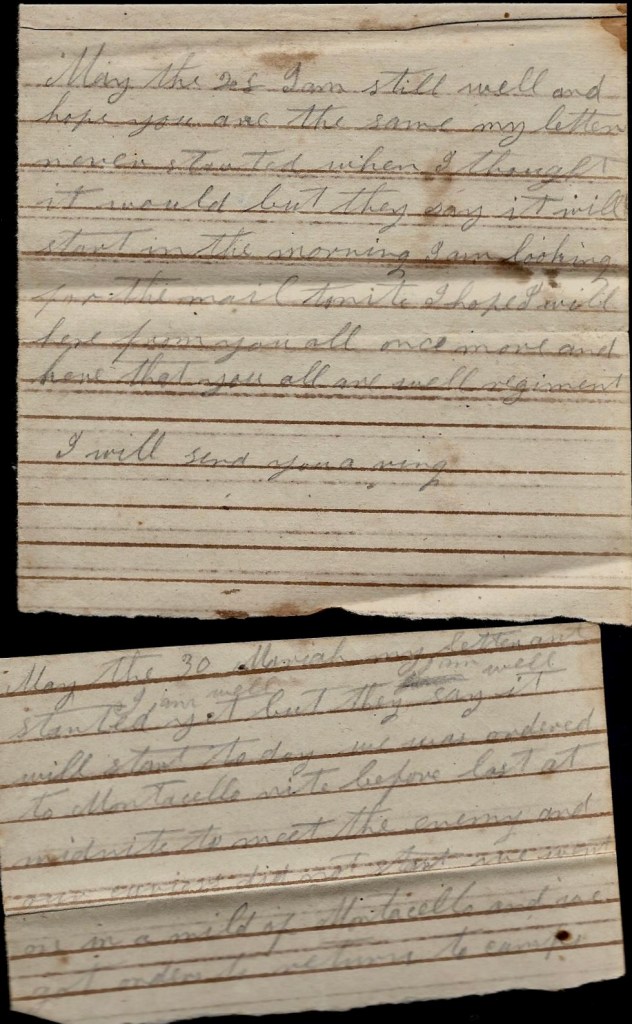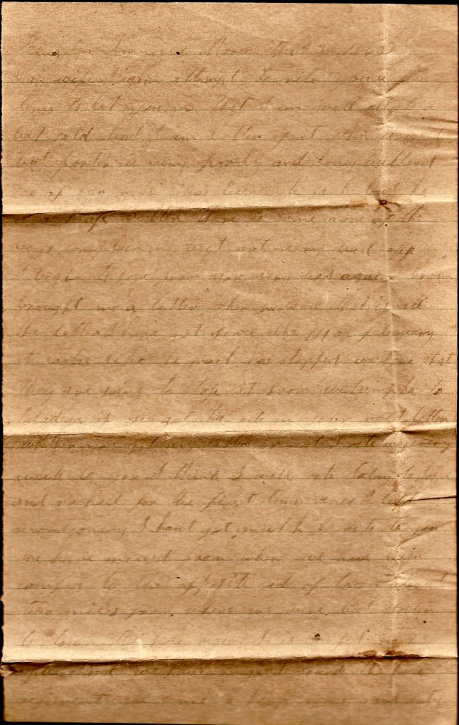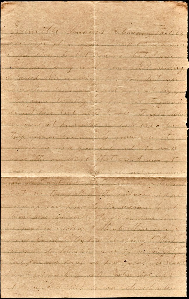 It is again that I take my pen in hand to write you a few lines to let you know that we are going to leave here tomorrow morning at 7 o’clock. We are going to join Pegram’s command at Clinton, 28 miles from here. We will leave our tents here. We have sent them to town. We will leave this time to stay, I think. You may still send your letters here till you hear from me. I will write as soon as I get to where we stop.