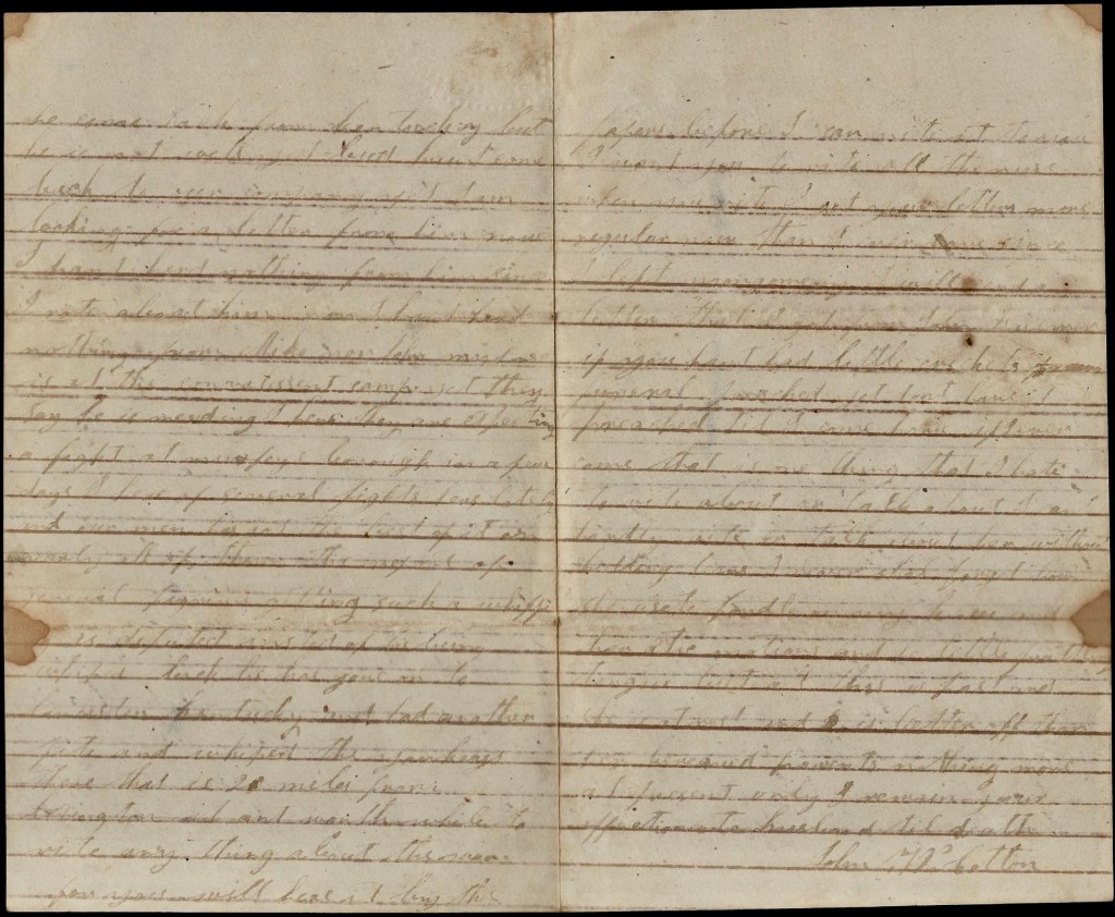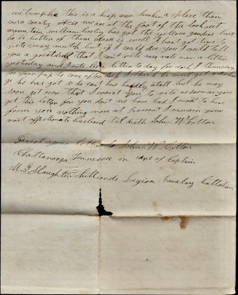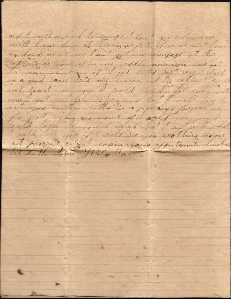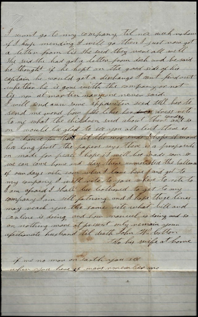 I hant got nary letter from Dock but I heard he was coming to the company soon. I expect that he is at our old camp with the rest of the boys. Well I reckon this letter will start tomorrow. Nothing more at present, only remain your true, devoted husband till death. Think of me when far away for I may be nearer in a coming day. — John W. Cotton