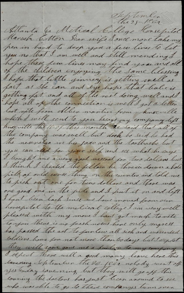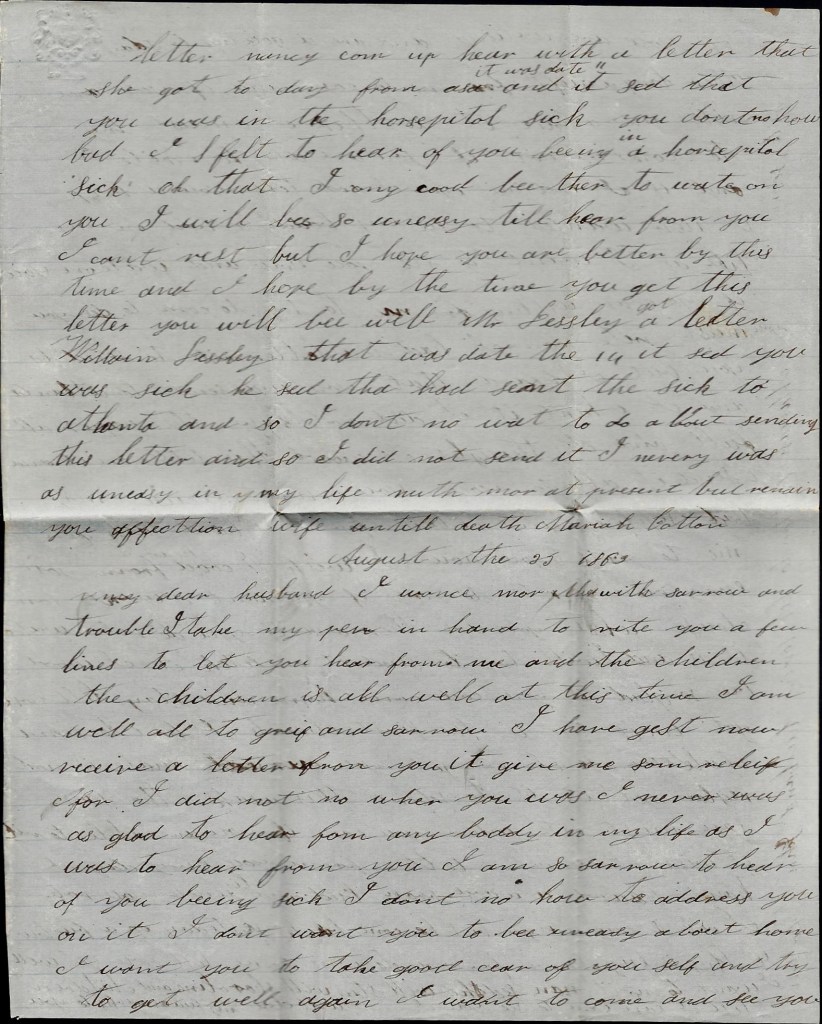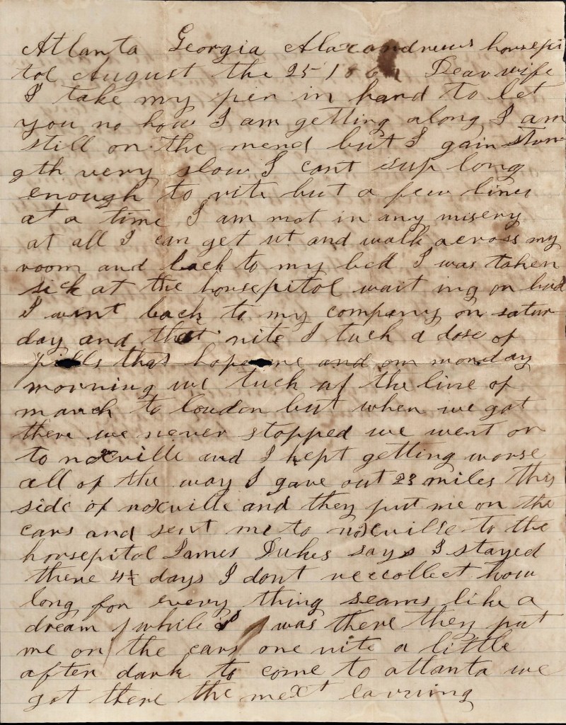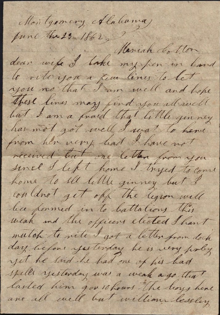 I take my pen in hand to write you a few lines to let you know that I am well and I hope these few lines may find you and the children all well. Dock has been very sick but he is a good deal better. He had like to have died night before last. He had the congestive fever in his head. He left here this morning on the cars to go to Georgia on a 14-day furlough. The rest of us are well except William Lessley. He is complaining some. The most of the men has gone home with the measles.