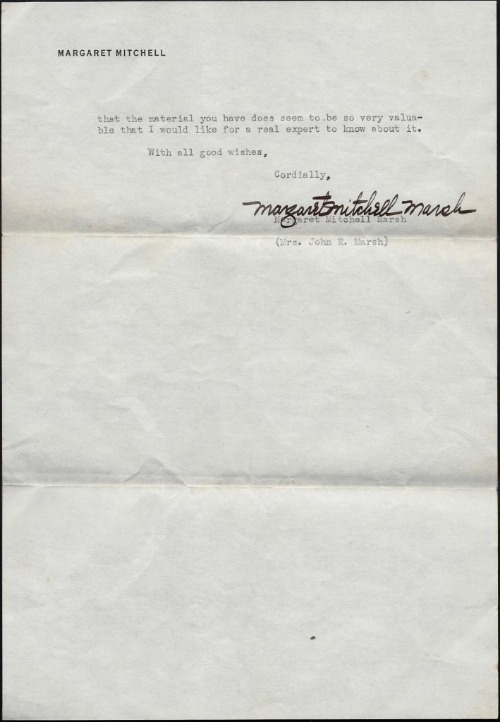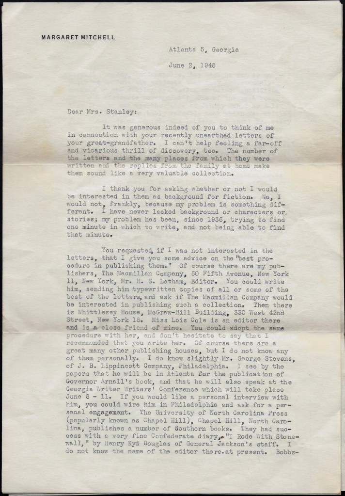 To illustrate just how rare these letters are, let me just add that the descendants clung to them for years looking for an opportunity to publish them. After Margaret Mitchell wrote her blockbuster book, Gone with the Wind in 1936, followed a couple years later by the David O. Selznick produced movie, there was a resurgence of “Old South” and “Lost Cause” literature in the 1940s. This prompted the family to submit a synopsis of the letters to Margaret with the suggestion that she might, perhaps, write another similar book of fiction using the Cotton family and the Cotton letters as her inspiration. Margaret’s response speaks for itself: