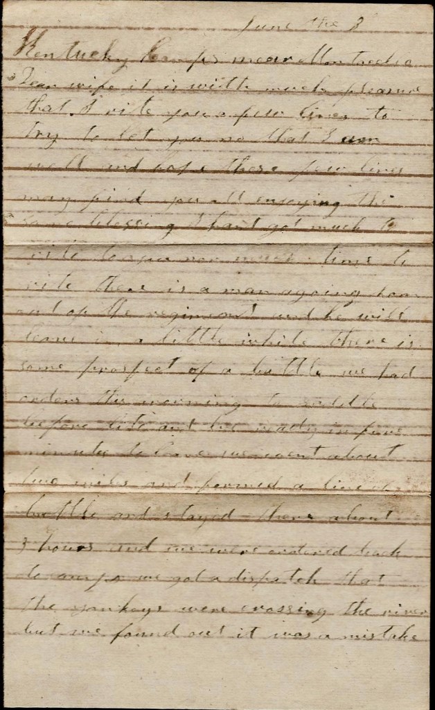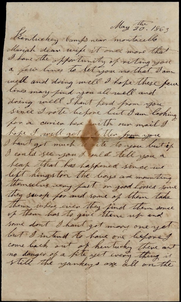 May 30th, 1863 Mariah, my letter ain’t started yet but they say it will start today. We was ordered to Monticello night before last at midnight to meet the enemy and our couriers did not start. We went on [with]in a mile of Monticello and we got orders to return to camp. You ought to have been here to have heard the boys curse. They wanted to go on. they said it was a misunderstanding betwixt two generals that we were ordered out. We heard that the Yankeys was crossing the river by thousands but it was all false. If I could only see you I could tell you a heap. I am well.