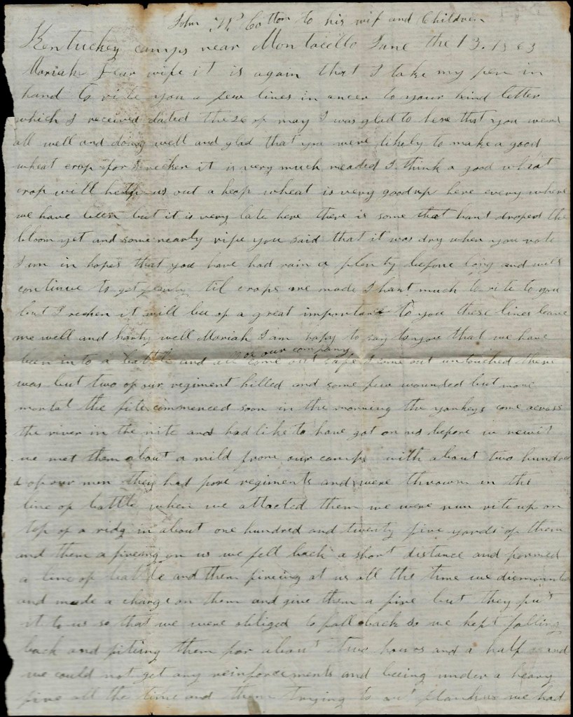1 For a great article regarding the fight that took place on 9 June 1863 which Cotton describes in this letter, see The Battle of Mill Springs 1863 published by Darryl R. Smith on 10 June 2021, The Western Theater in the Civil War. The Union forces engaged initially were from Co. F, 45th Ohio Mounted Infantry and from Co. C, 7th Ohio Cavalry. More of Wolford’s Brigade later joined in the fight.