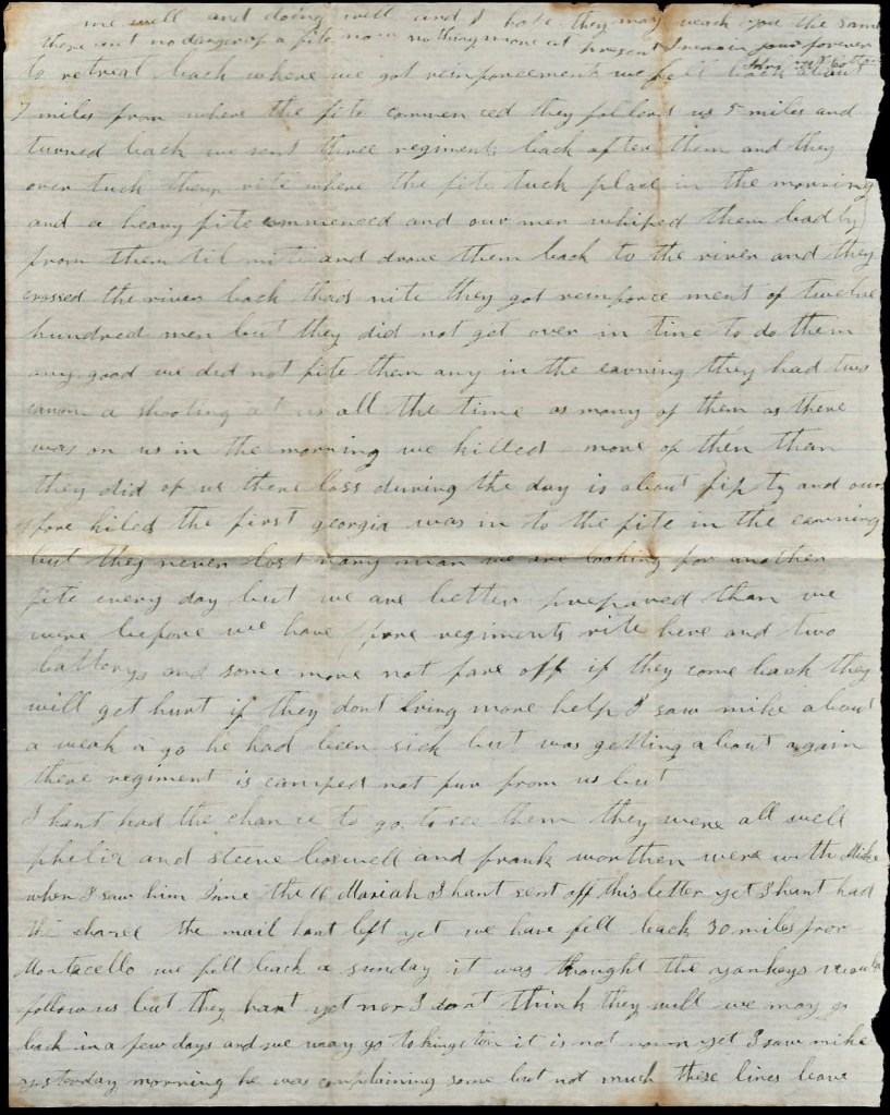 So we kept falling back and fighting for about two hours and a half and we could not get any reinforcements and being under a heavy fire all the time and them trying to out flank us, we had to retreat back where we got reinforcements. We fell back about 7 miles from where the fight commenced. They followed us 5 miles and turned back. We sent three regiments back after them and they overtook them right where the fight took place in the morning and a heavy fire commenced and our men whipped them badly from then till night and drove them back to the river and they crossed back. That night they got reinforcements of twelve hundred men but they did not get over in time to do them any good. We did not fight them any in the evening. They had two cannon a shooting at us all the time.