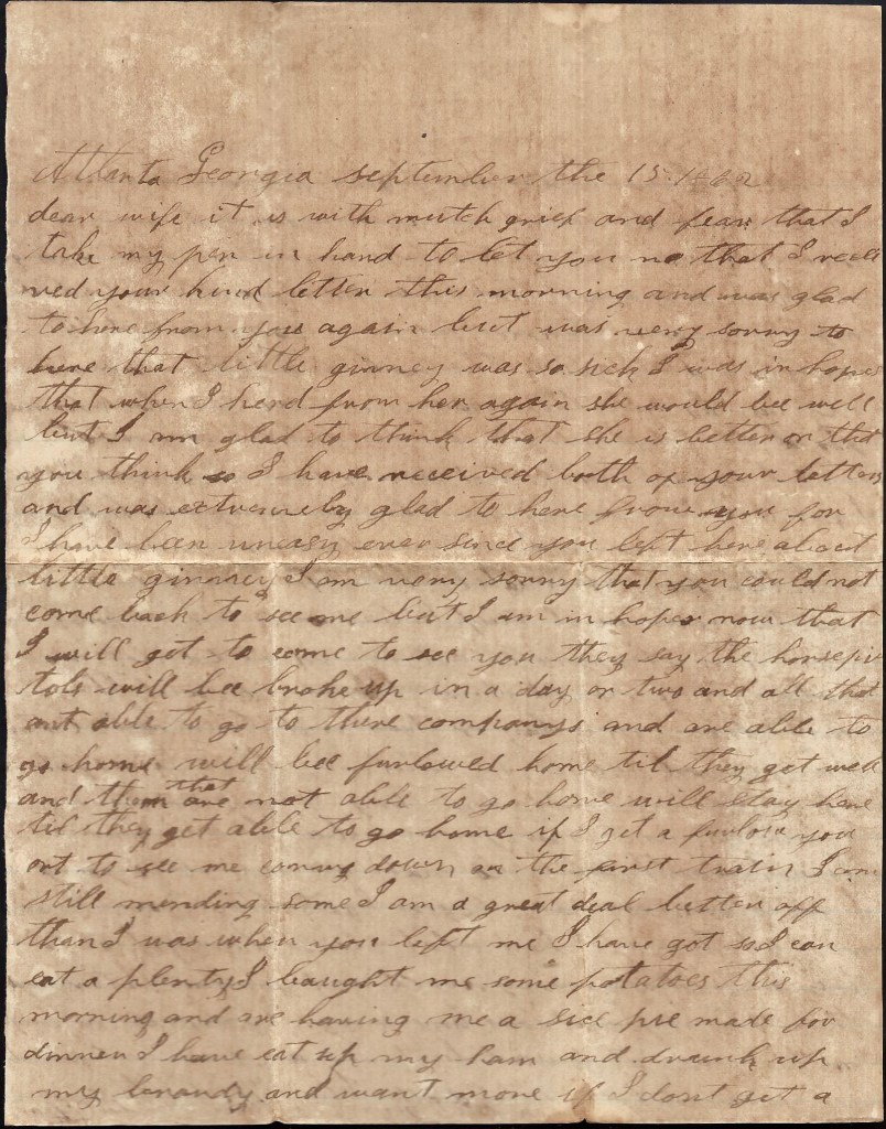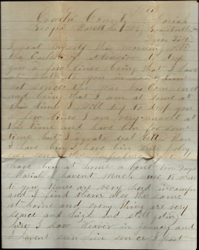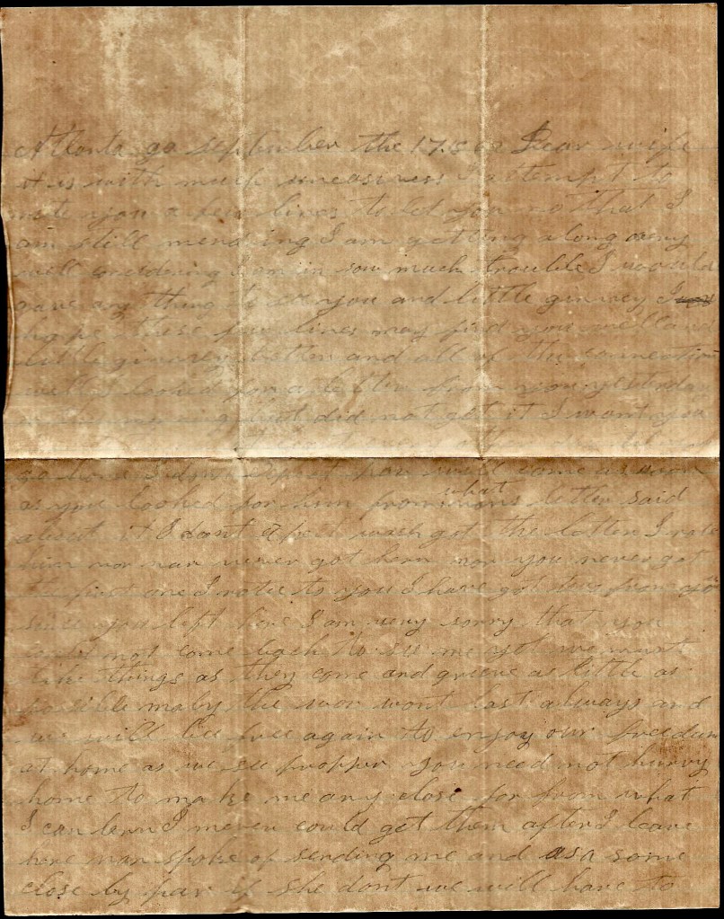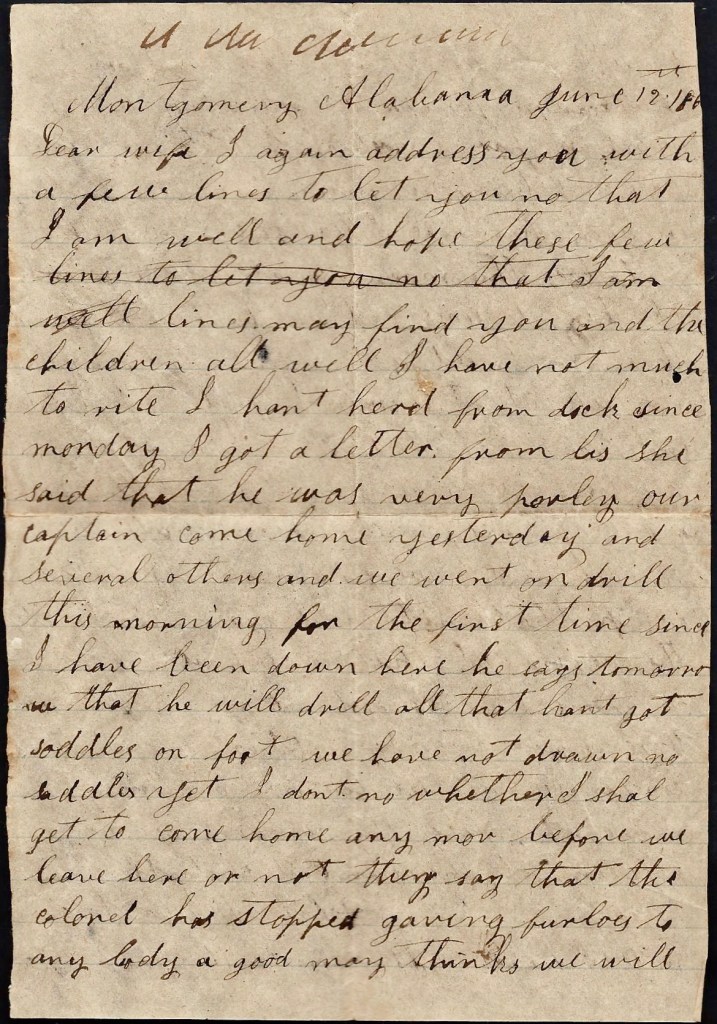 Me and Dock left Montgomery yesterday morning and we stayed at your pap’s last night. Our Company was to leave today and we are to meet it tomorrow at Grantville and go on with them. We are going to Atlanta. I would be very glad to hear from you all for I hant heard from you since I left home [on furlough]. I want you to write to me as soon as you get this letter. Direct your letter to Atlanta, Georgia.