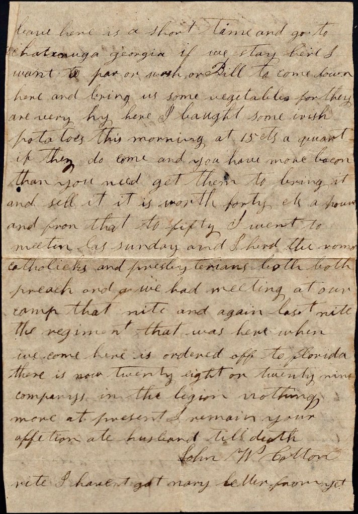 I went to meeting last Sunday and I heard the Roman Catholic’s and the Presbyterian’s both preach and we had meeting at our camp that night and again last night. The regiment that was here when we came here is ordered off to Florida. There is now twenty-eight or twenty-nine companies in the Legion. Nothing more at present. I remain your affectionate husband till death, — John W. Cotton