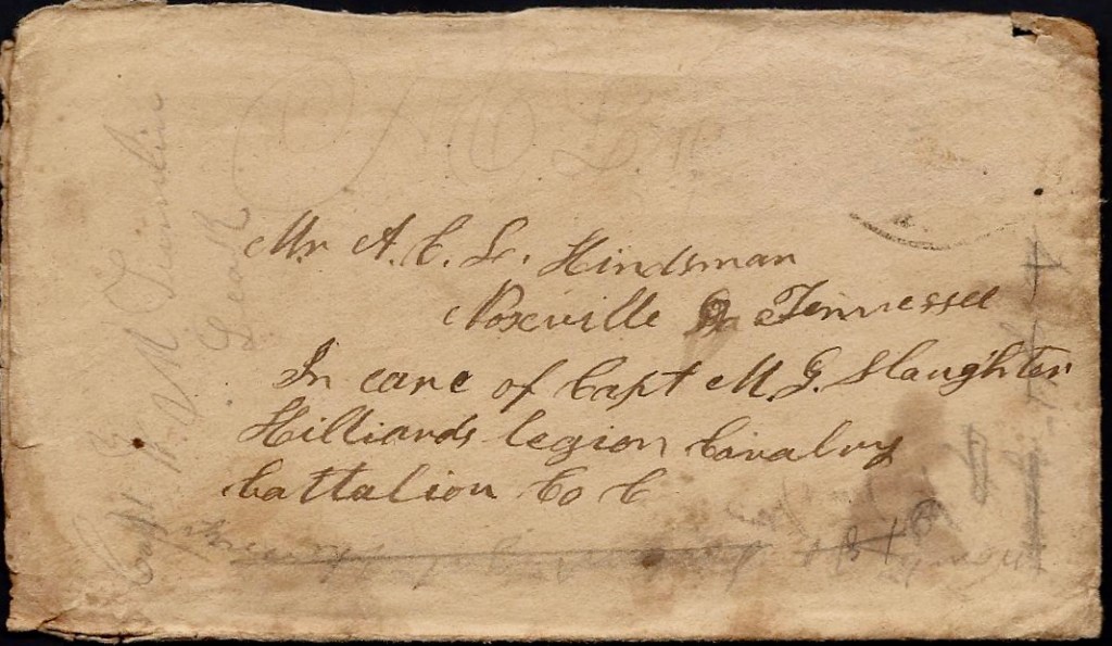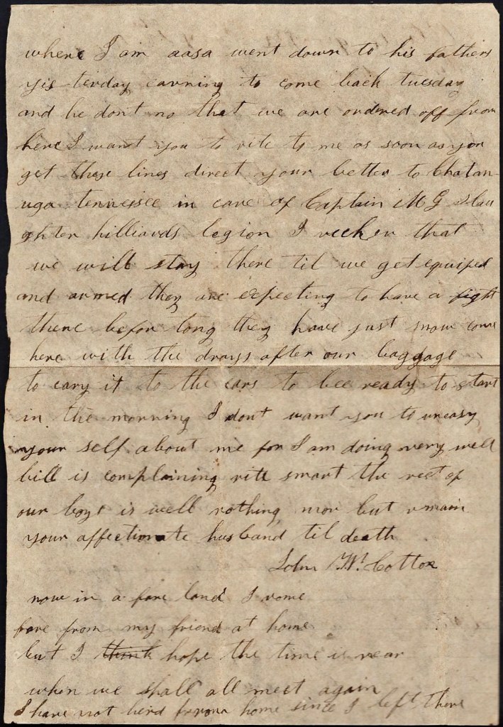 I hant much to write to you—only to let you know where I am. Asa went down to his father’s yesterday evening to come back Tuesday and he don’t know that we are ordered off from here. I want you to write to me as soon as you get these lines. Direct your letter to Chattanooga, Tennessee, in care of Captain M. G. Slaughter, Hilliard’s Legion. I reckon that we will stay there till we get equipped and armed. They are expecting to have a fight there before long.