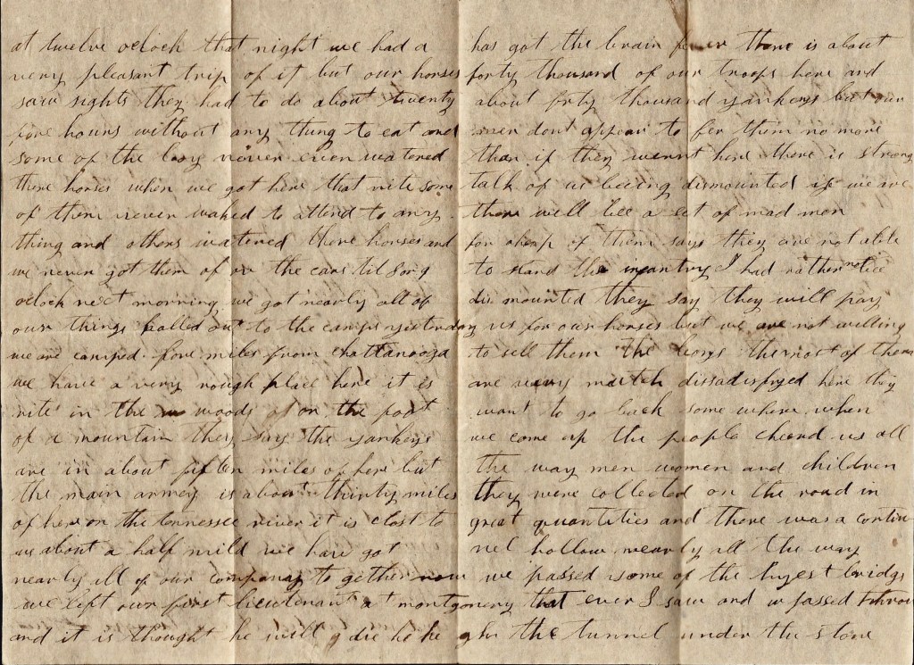 I wrote to you last Sunday when we were at Atlanta. We left there Monday morning at ten o’clock and we landed at Chattanooga at twelve o’clock that night. We had a very pleasant trip of it but our horses saw sights. They had to do about twenty-five hours without anything to eat and some of the lazy [boys] never even watered their horses when we got here that night. Some of them never waked to attend to anything and others watered their horses [for them] and we never got them off the cars until 8 or 9 o’clock next morning. We got nearly all of our things hauled out to camp yesterday.