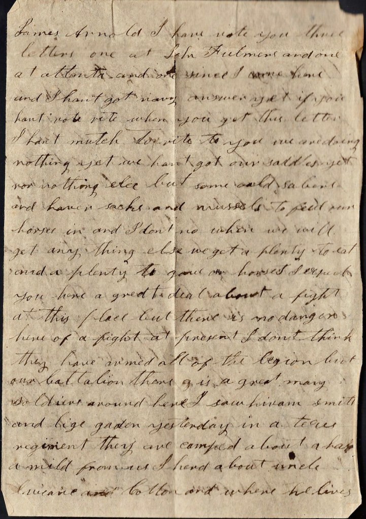 I now once more take my pen in hand to write you a few more lines to let you know where I am and how I am. I am as well as I ever was in my life and I hope these few lines may reach you all the same. I got the letter that you sent to me by James Arnold. I saw him at Dalton in Georgia. Him and Frank Corley stopped there waiting for passage on the cars and we overtook them. They went to Knoxville and we went to Chattanooga. I was very glad to hear from you. It was the first time since I left home [after my furlough]. I would be glad to hear from you all again today.