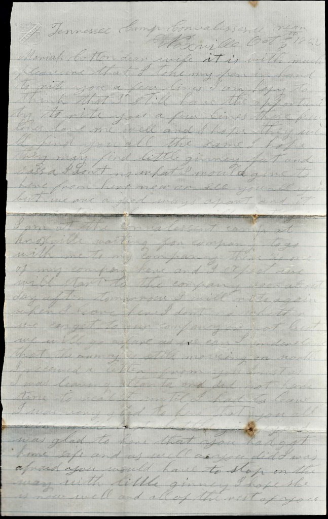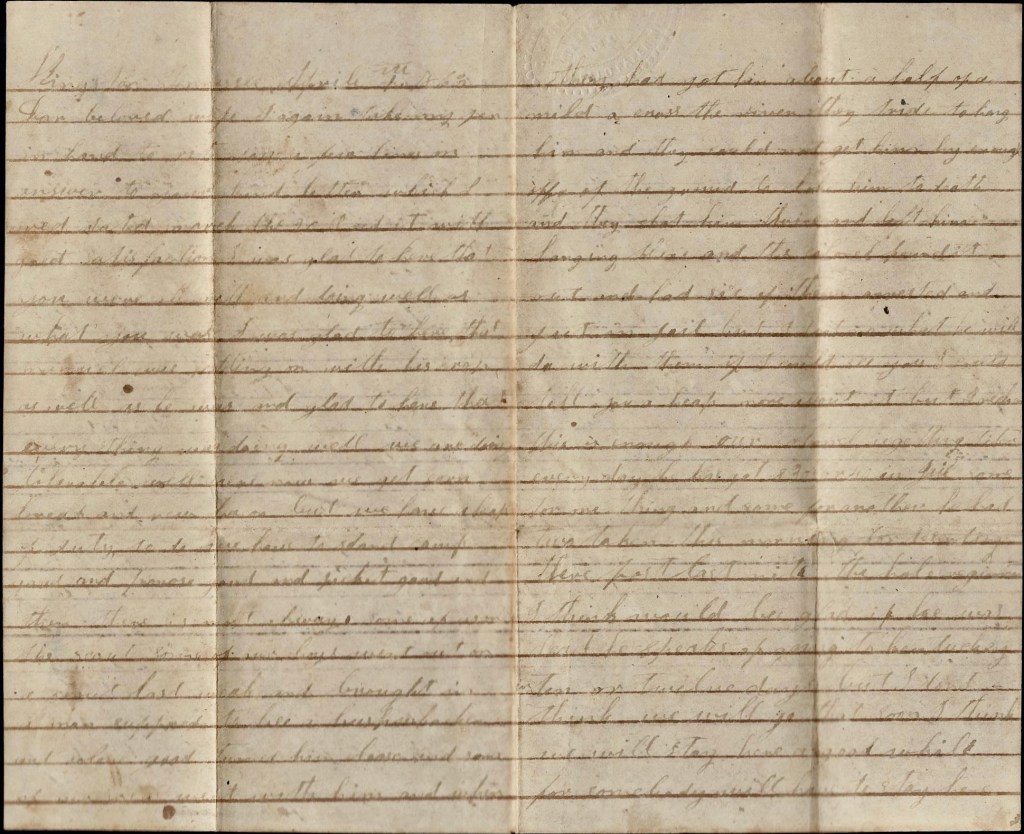 Nothing more has happened since yesterday. We went of dress parade yesterday and today we have not put out no guards around the encampment yet. We are doing nothing yet but go to town or anywhere else we want to. I don’t mind anything that is to do here—only having to stay from home. I am well today but some of the company is complaining. I have just now received a letter from you and I was glad to hear from you and to hear that you all was well and that all was going on well and that the wheat was doing better. I want to see you and the children as bad as anybody can.