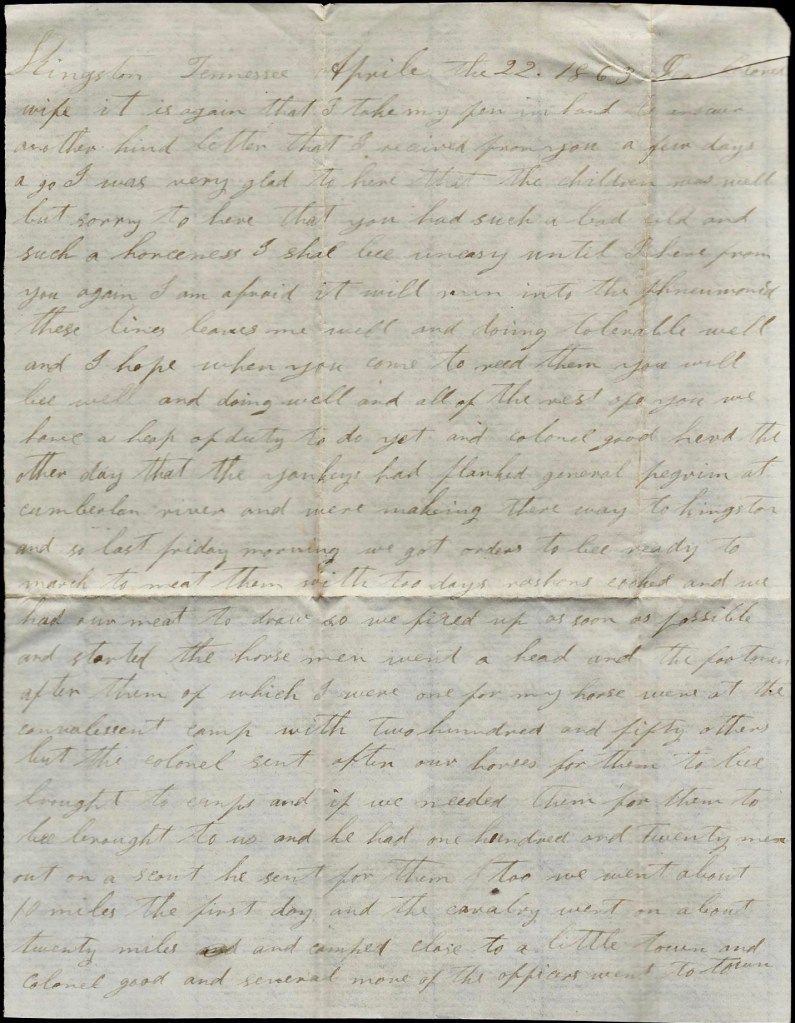 We have a heap of duty to do yet and Colonel Goode heard the other day that the Yankeys had flanked General Pegram at Cumberland River and were making their way to Kingston and so last Friday morning we got orders to be ready to march to meet them with two days rations cooked and we had our meat to draw so we fired up as soon as possible and started. The horsemen went ahead and the footmen after them of which I were one for my horse went at the convalescent camp with two hundred and fifty others but the Colonel sent after our horses for them to be brought to us and he had one hundred and twenty-five men out on a scout. He sent for them too.