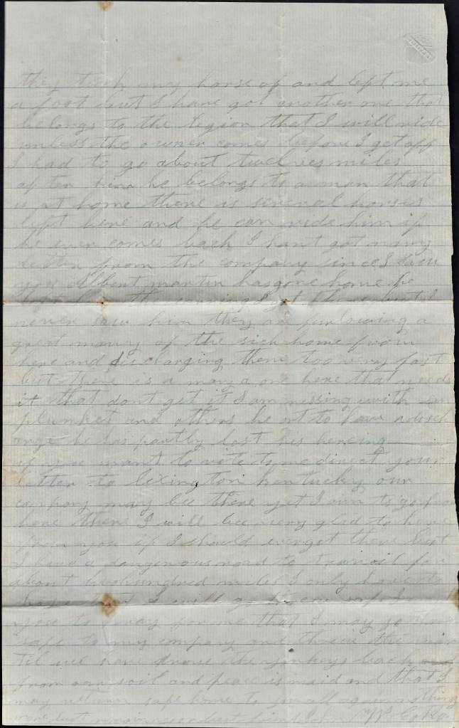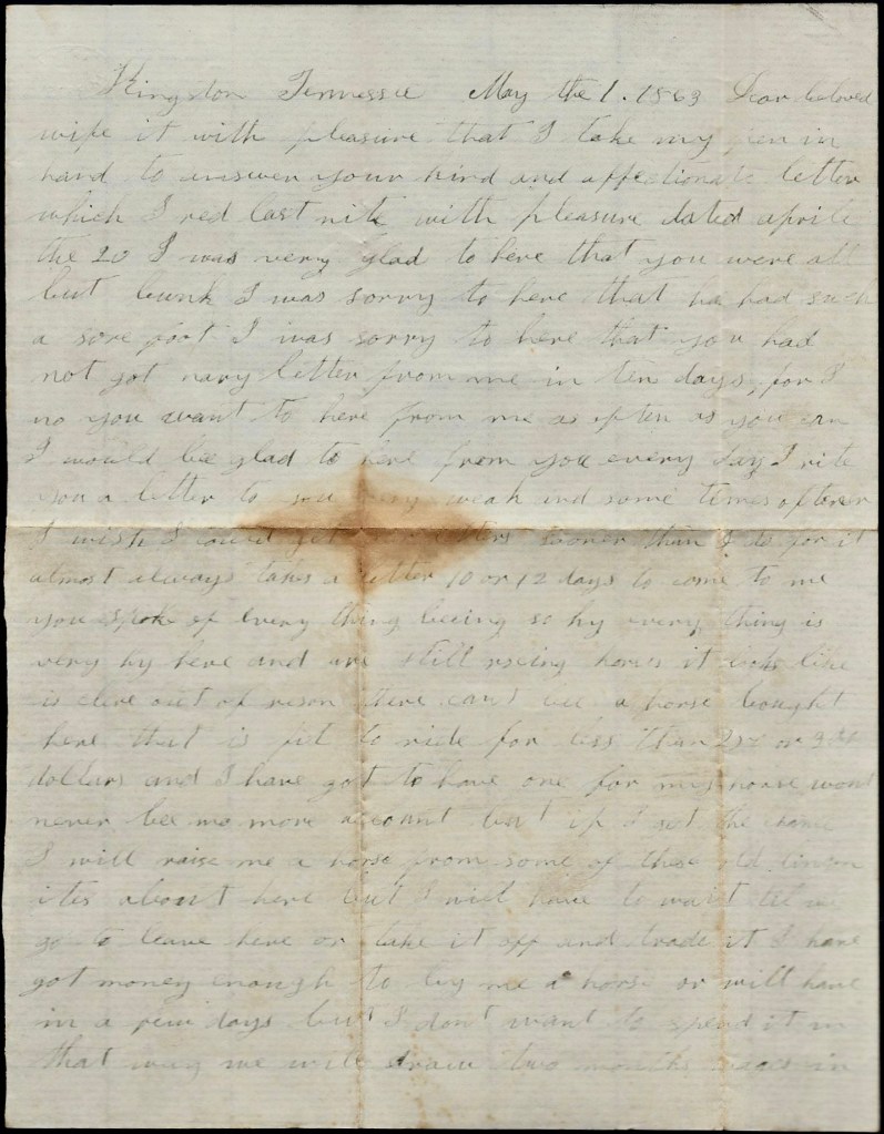 Everything is very high here…there can’t be a horse bought here that is fit to ride for less than 250 or 300 dollars and I have got to have one for my horse won’t never be no more account. But if I get the chance, I will raise me a horse from some of these old Lincolnites about here or take it off and trade it. I have got money enough to buy me a horse—or will have in a few days—but I don’t want to spend it in that way. We will draw two months wages in a few days. We were mustered yesterday for our pay. They will pay us up to the first of May.