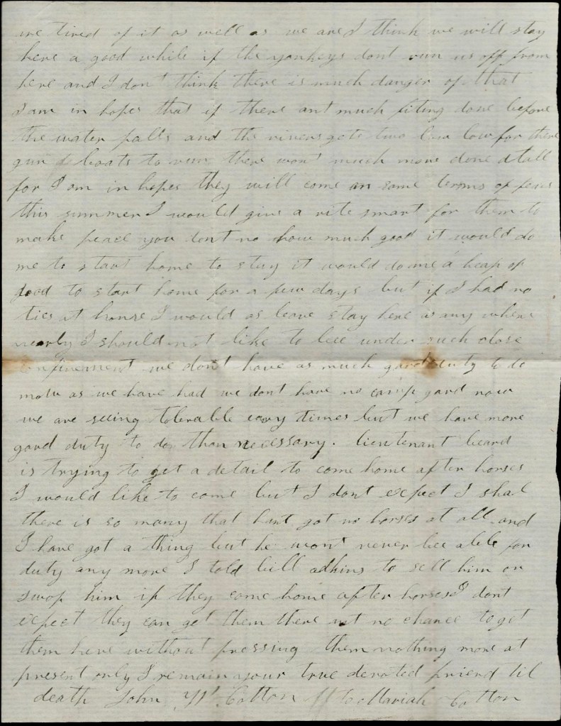 We are seeing very tolerable times but we have more good duty to do than necessary. Lieutenant Baird is trying to get a detail to come home after horses. I would like to come but I don’t expect that I shall. There is so many that hant got no horses at all and I have got a thing but he won’t never be able for duty anymore. I told Bill Adkins to sell him or swap him. If they come home after horses, I don’t expect they can get them there. Ain’t no chance to get them here without pressing them.