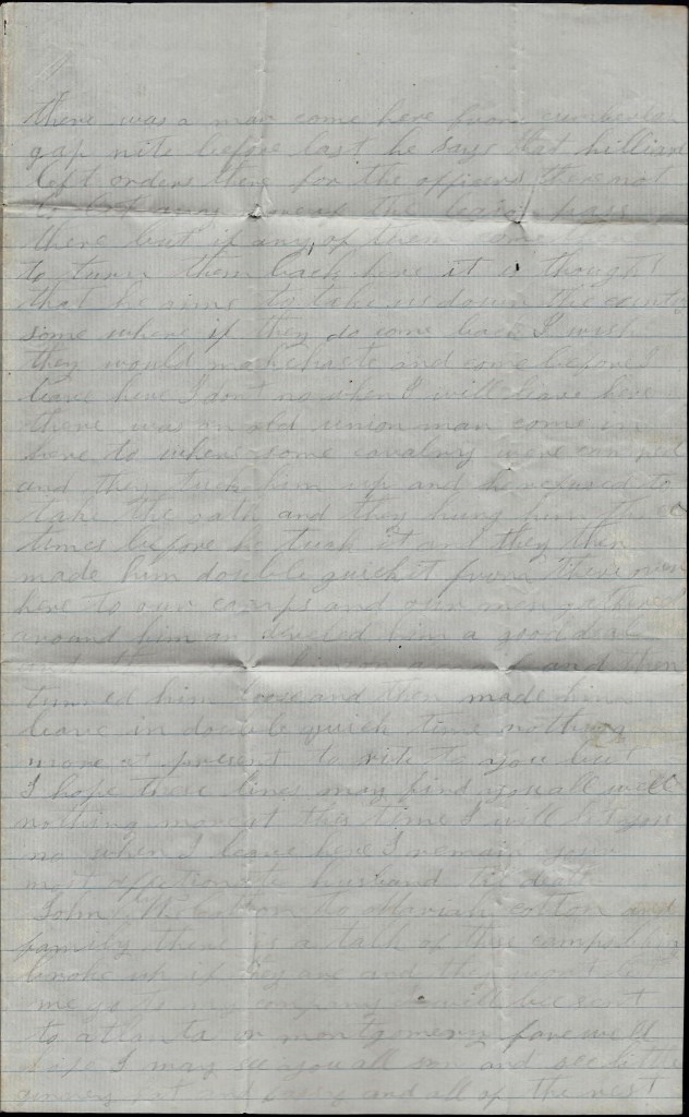 Our Captain [M. G. Slaughter] came home [back to camp] yesterday and several others and we went on drill this morning for the first time since I have been down here. He says tomorrow that he will drill all that hant got saddles on foot. We have drawn no saddles yet. I don’t know whether I shall get to come home anymore before we leave here or not. They say that the Colonel has stopped giving furloughs to anybody. A good many thinks we will leave here in a short time and go to Chattanooga, Georgia.