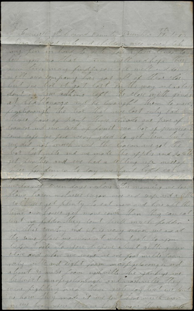 I hear they are expecting a fight at Murfreesboro in a few days. I hear of several fights here lately and our men has got the best of it on nearly all of them. The report of General Pegrams getting such a whipping is disputed. Instead of his being whipped back, he has gone on to Lancaster, Kentucky, and had another fight and whipped the Yankeys there. That is 20 miles from Lexington. It ain’t worthwhile to write anything about the war for you will hear it by the papers before I can write it to you. I want you to write all the news when you write. I get your letters more regular now than I ever have since I left Montgomery. I send a letter that I got from John Fulmer.