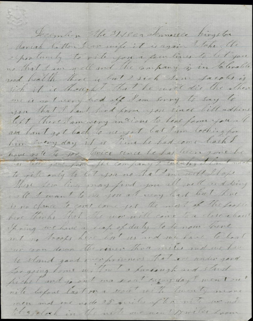 We have plenty to eat now and a plenty to do. We are on duty about every other day. There is one hundred and twenty of our men gone on a 15-day scout and we started 7 men yesterday morning with a dispatch to Monticello. General [John] Pegram’s Brigade went to Kentucky and met the Yankeys and got a whipping [Battle at Dutton’s Hill north of Somerset] and had to fall back. John Trammel’s company is in the brigade but he was not with them. He was left not far from here with some horses and mules to fatten up and [your brother] Mike wasn’t with them neither for he was sick when they started to Kentucky and I hant heard from him yet. I wrote about his being sick before.