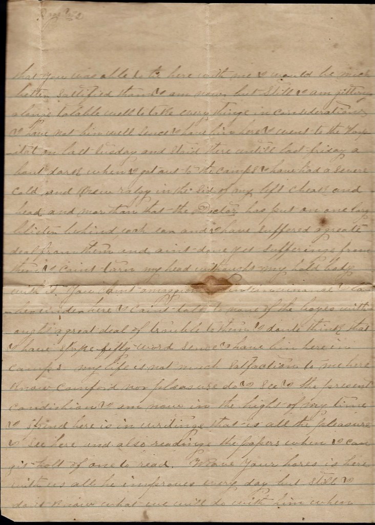 You said you was in hopes you would make some wheat if the rust did not kill it. I am in hopes you will make a good crop of small grain and corn too, and i hope I will get home to help gather corn but I am afraid [I will] not. There is more men wanting the war to end than ever I saw. They are all getting tired of it. If the big officers were as tired of it as the poor privates, it would soon end but I am afraid they will carry it on a heap longer.
