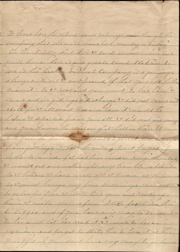 I am getting very anxious to cross the river among the Yankeys and so is a heap of our men. I hant got me nary horse yet but my old horse would do a right smart service yet if he could get a plenty to eat. I think if I could cross the river I could get a horse from the Yankeys that would not cost me nothing. I am to get another before I leave Kentucky anyhow. There is lots of boys got horses since we came up here. Captain Slaughter has resigned and gone home and we have another election for lieutenant. I ran against our orderly sergeant and got beat and we elected William Lessley for our orderly sergeant…