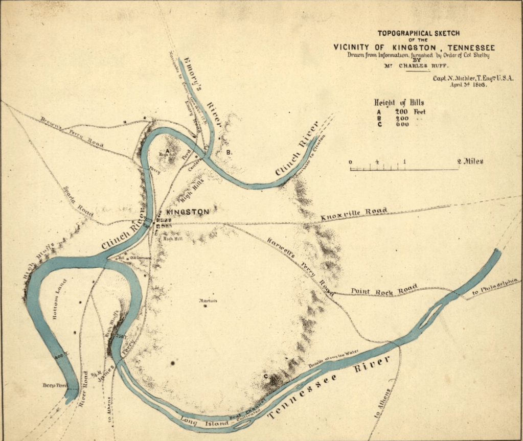 1 The location of the original encampment was “right in the fork of the Tennessee and Clinch rivers” according to Cotton. The following map a location marked “Old Garrison” which was probably the location referred to.