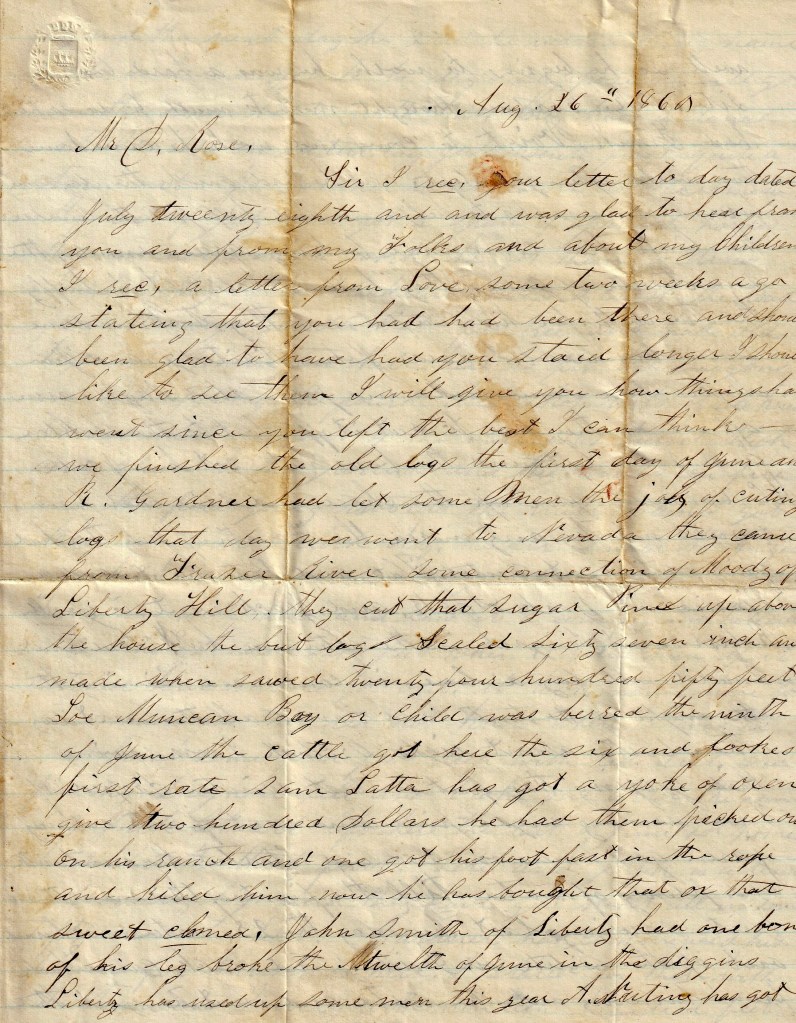 Joe Muncan’s [Munson’s] boy, or child, was buried the 9th of June. The cattle got here the sixth and looked first rate. Sam Latta has got a yoke of oxen. Give two hundred [for them]. He had them picketed out on his ranch and one got his foot fast in the rope and killed him. Now he has bough that ox that Sweet claimed. John Smith of Liberty had one bone of his leg broke the 12th of June in the diggins. Liberty has used up some men this year. A[bert] Nutting has got well so he begins to work. He was a hard-looking sight. R. Gardner though most too much to do so. He had Frank Voigt to come and work. He came some two weeks after you left and he had one by the day some four or five weeks to help me and help pile the lumber.