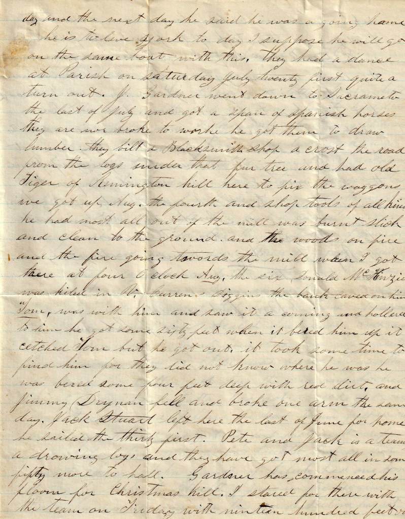 Donald McKenzie was killed in V[alentine] Curran’s diggins [when] the bank caved in on him. He got some sixty feet when it buried him up. It catched Tom [too] but he got out. It took some time to find him for they did not know where he was was. He was buried some four feet deep with red dirt and [7 year-old] Jimmy Dryman fell and broke one arm the same day. Jack Stuart left here the last of June for home. He sailed the thirty-first. Pete [Rose] and Jack is a team a drawing logs and they have got most all in, some fifty more to haul. Gardner has commenced his flume for Christmas Hill. I started for there with the team on Friday with nineteen hundred feet [of lumber] and got down below long ravine where that bridge was. They took off the plank and filled in with brush and dirt. I went on and over went the load and wagon on top so I came back and tried it again. Yesterday I went through but they had to fix it some.