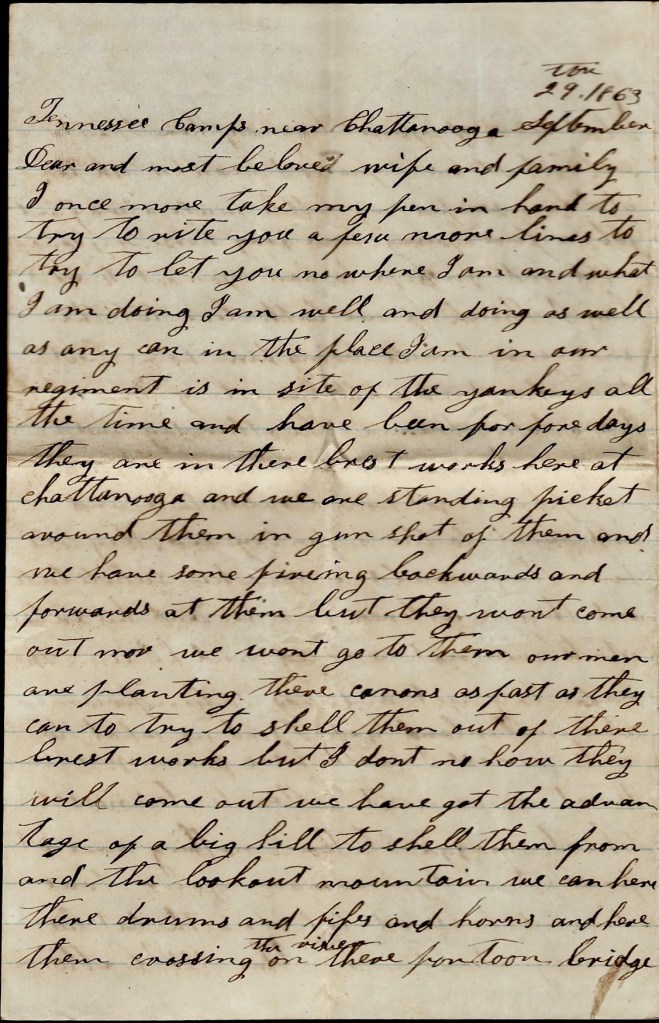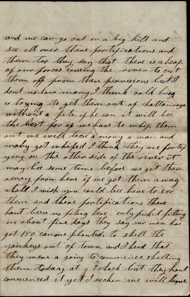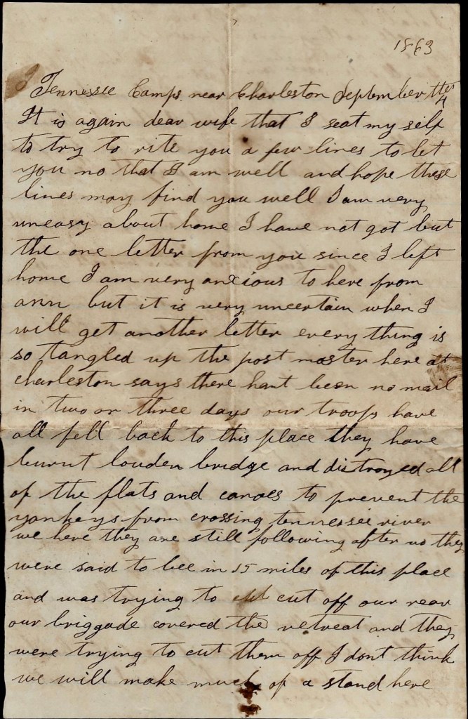 Our troops have all fell back to this place. They have burnt Loudon bridge and destroyed all of the flats and canoes to prevent the Yankeys from crossing the Tennessee river. We hear they are still following after us. They were said to be [with]in fifteen miles of this place and was trying to cut off our rear. Our Brigade covered the retreat and they were trying to cut them off. I don’t think we will make much of a stand here nor I don’t know where we will make a permanent stand but I think there will be one of the hardest battles fought here that has ever been fought. They say we have got over one hundred thousand men round about here.