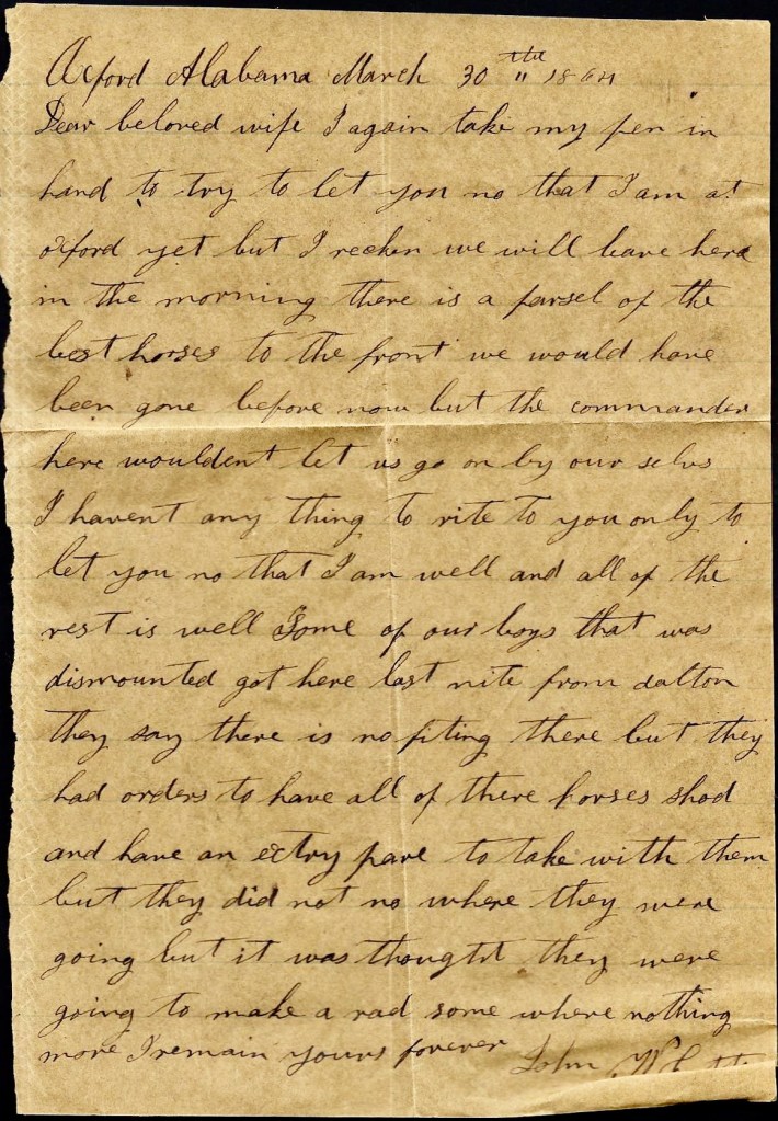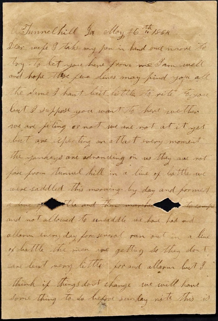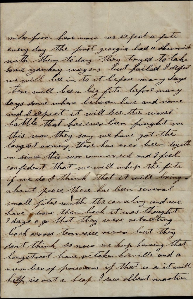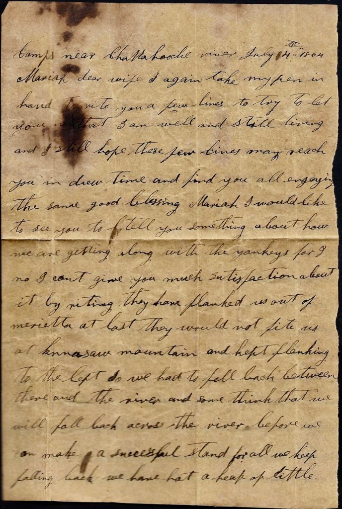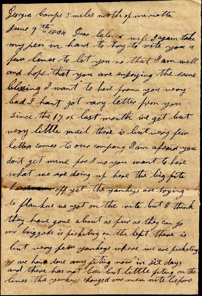 I can’t write but little now for I hant got time. I have only stopped to rest. I hope these lines may find you all well and doing well. I shall be uneasy about Ann till I hear that she is well. Direct your next letter to Rome, Georgia. I would love to see you all again already but don’t be uneasy about me. I think if we get whipped in this fight, the war will soon end.