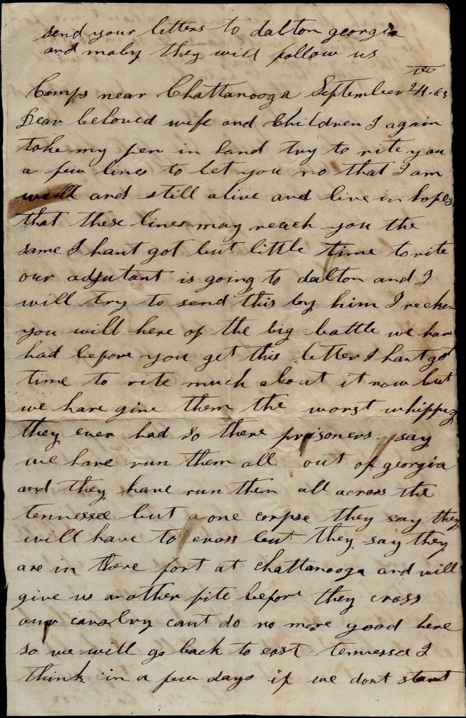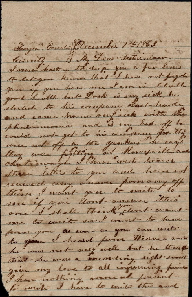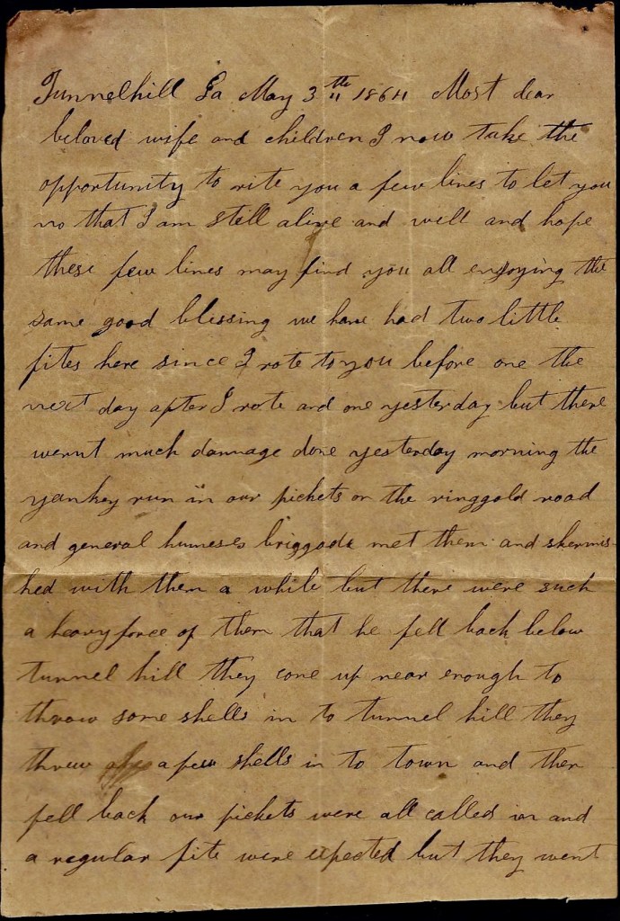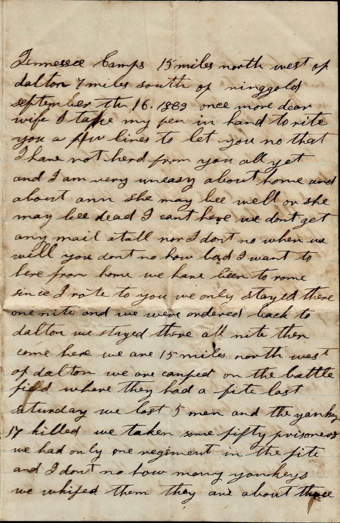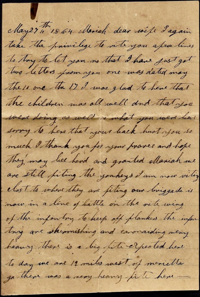 I can’t write but little now for I hant got time. I have only stopped to rest. I hope these lines may find you all well and doing well. I shall be uneasy about Ann till I hear that she is well. Direct your next letter to Rome, Georgia. I would love to see you all again already but don’t be uneasy about me. I think if we get whipped in this fight, the war will soon end.