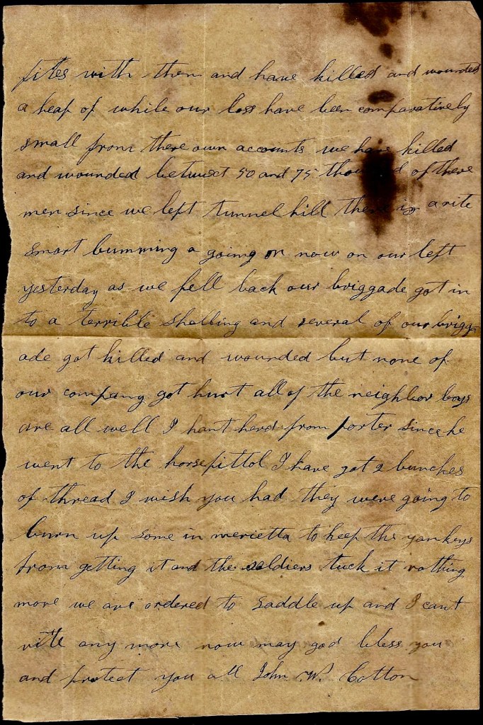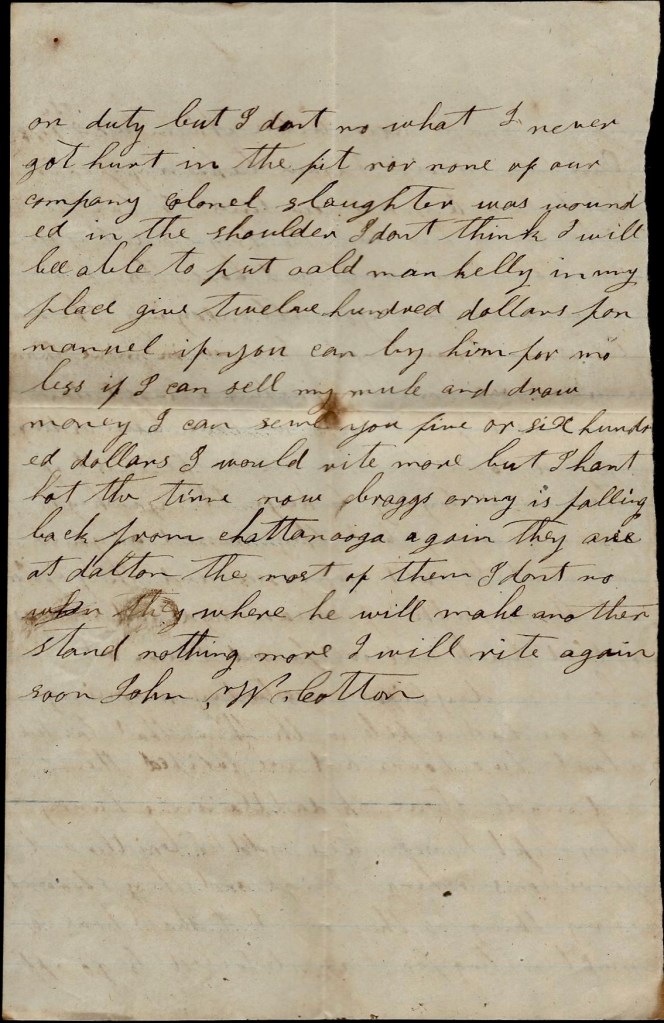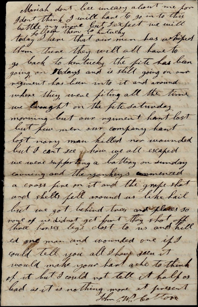 You spoke of my clothes. You need not be uneasy about me. I will try and get some before i get naked. I thought I would not write you about losing my clothes in the fight we had but i reckon you will hear it anyway. I lost my saddlebags and my blanket you sent me. I hated losing my blanket worse than I did my saddle bags but i hated losing all because they were things you had made for me. You need not be afraid I will get naked. I will get clothes somehow or other. I will have a good excuse now to come home. I am doing as well as anybody you ever saw away from home. I do almost as I please. I had to come out of Kentucky without a horse but my same old horse totes me yet but he is very poor and weak. Nothing more. I remain your true, devoted friend till death. — John W. Cotton