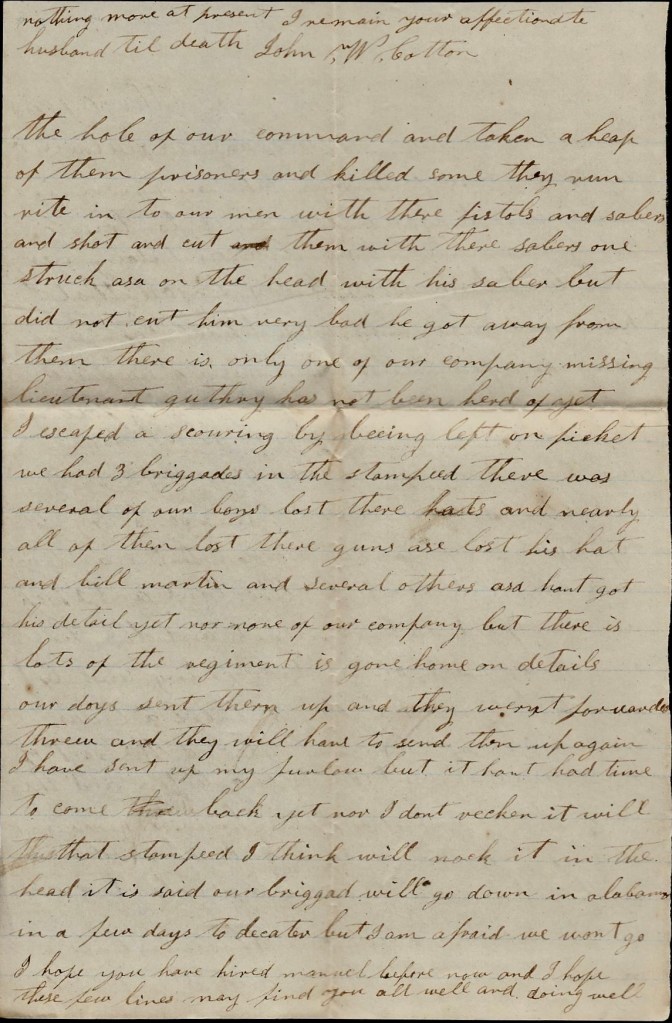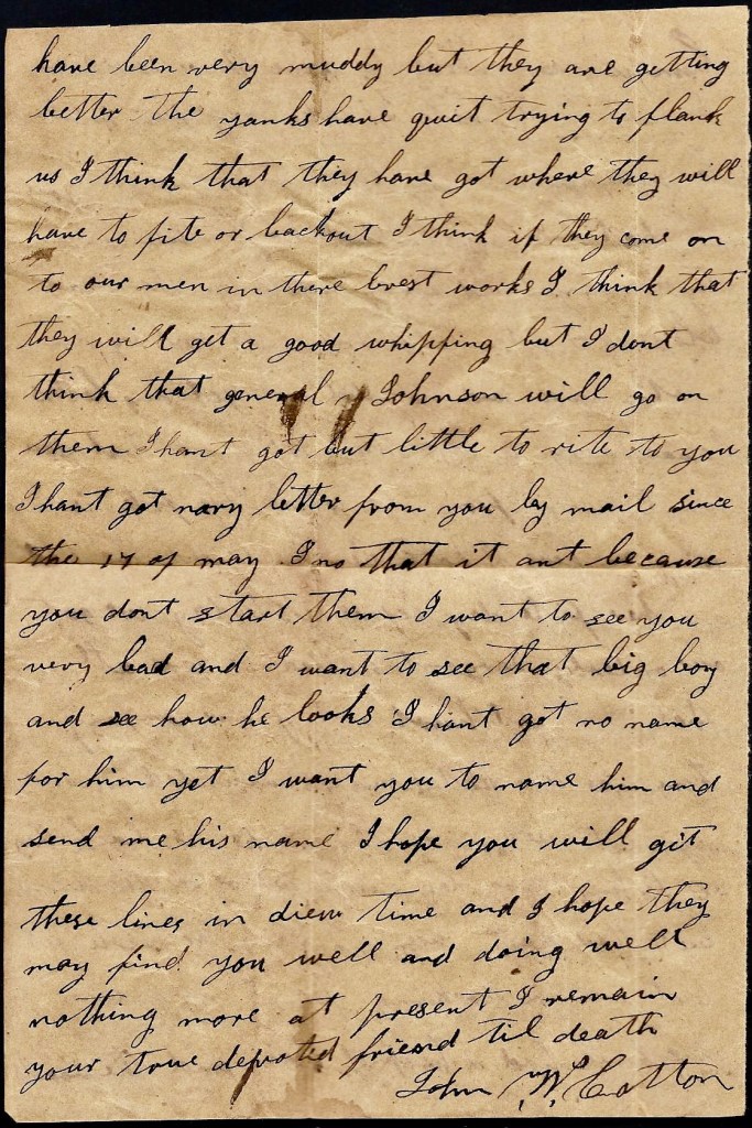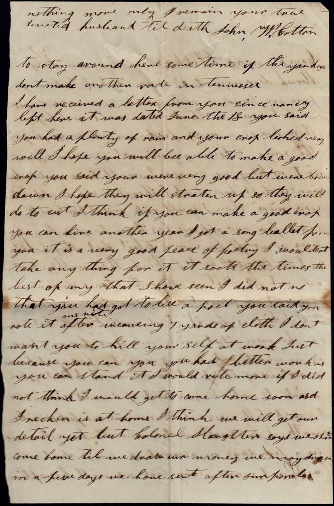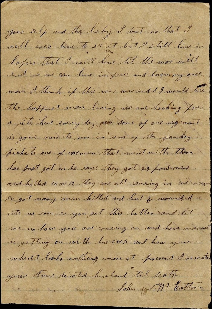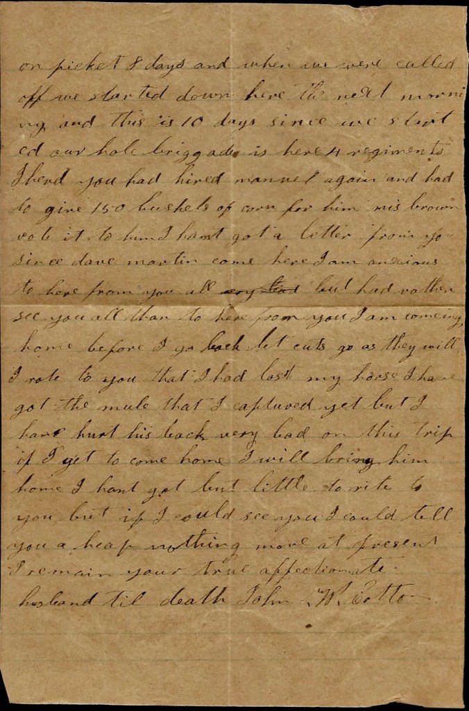 I hant got anything to write. I hant heard from home since I left home. I don’t know whether you will get this letter or not. Nothing more at present. I remain your true, devoted husband till death. — John P. Cotton