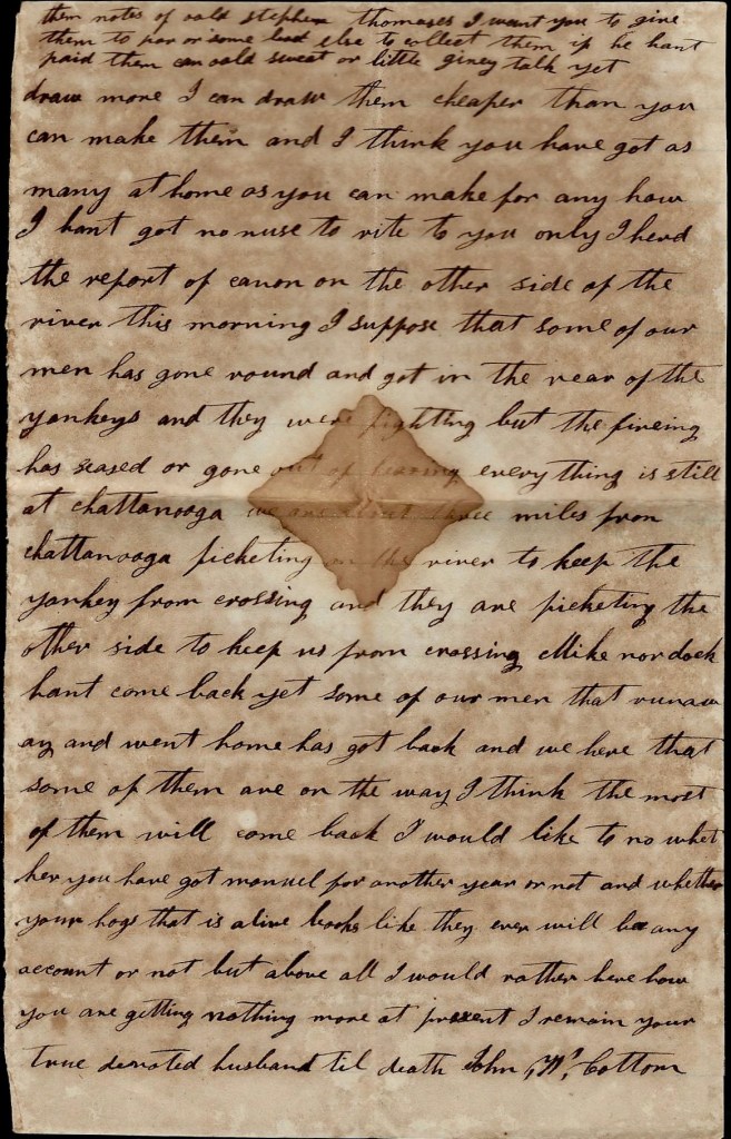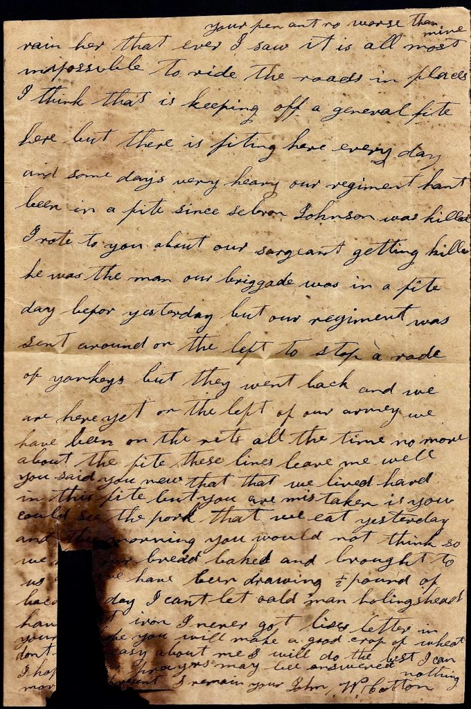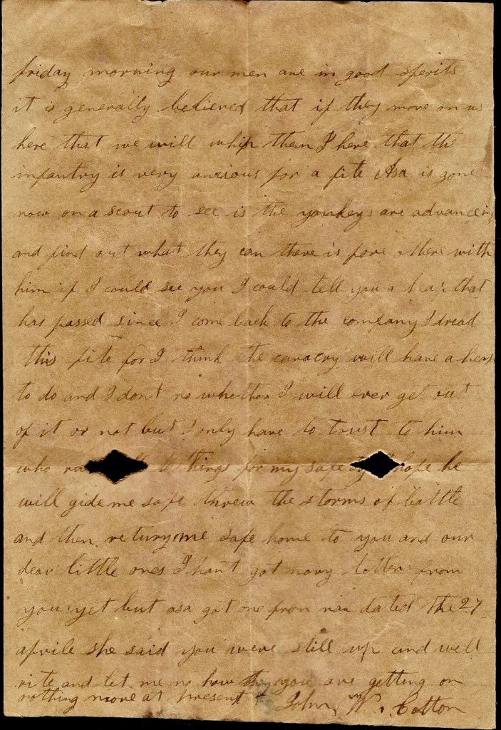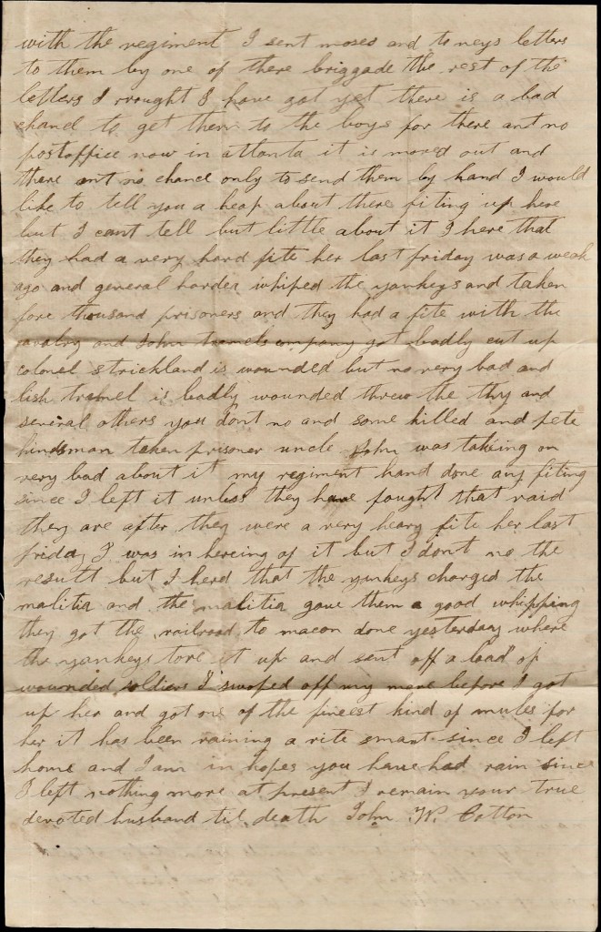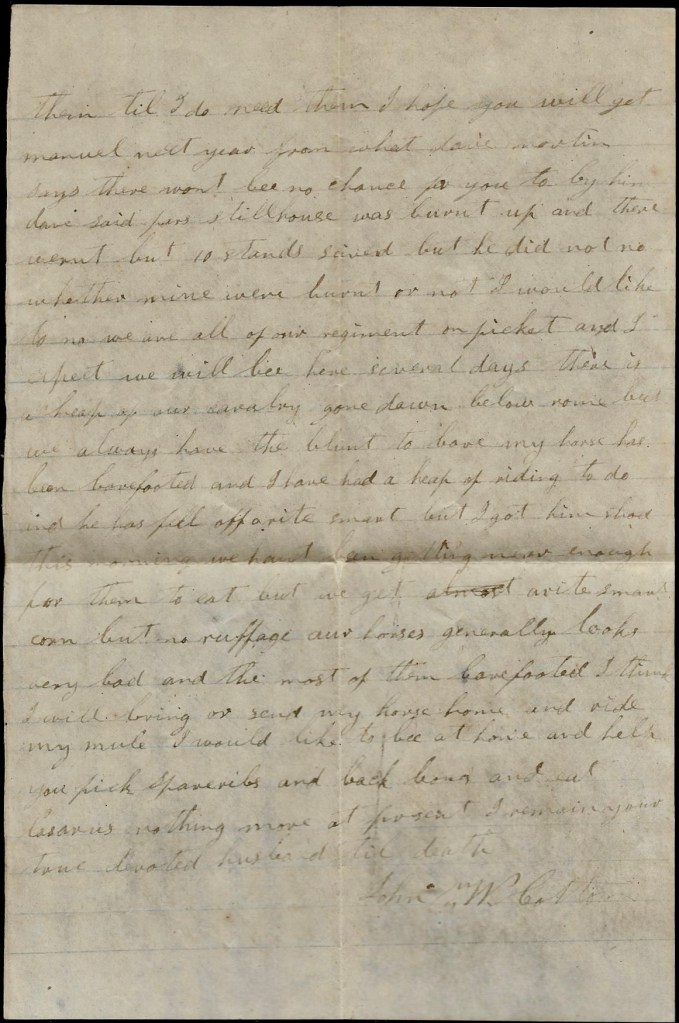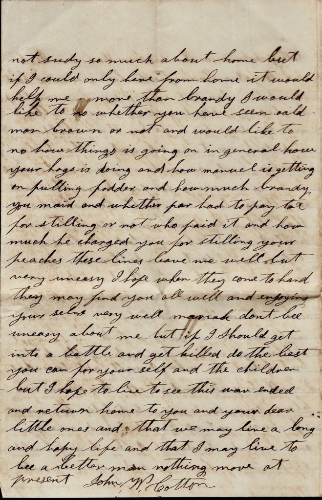 I hant got anything to write. I hant heard from home since I left home. I don’t know whether you will get this letter or not. Nothing more at present. I remain your true, devoted husband till death. — John P. Cotton
