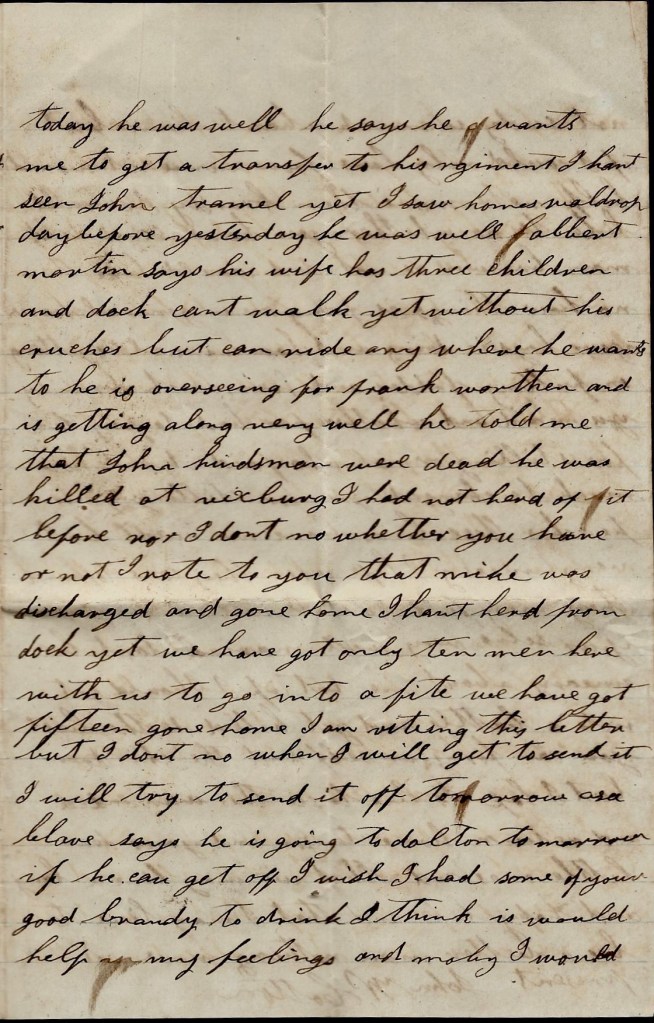 The most of us have just been to the pasture and got out our horses since I commenced writing. I aim to swap my mule off for a horse as soon as I get the chance. I saw Frank Worthen the other day and he said [your brother] Mike was discharged and gone home. He said John Trammel was not very well. They are going to move close to us. Dock hant come to us yet. I hant heard from him since he was with the company. I wrote to him but hant got no answer yet. I want to hear from home very bad and I am afraid that I will hear that Ann is no better but worse, but I have to live in hopes that she is better and all of the rest well.