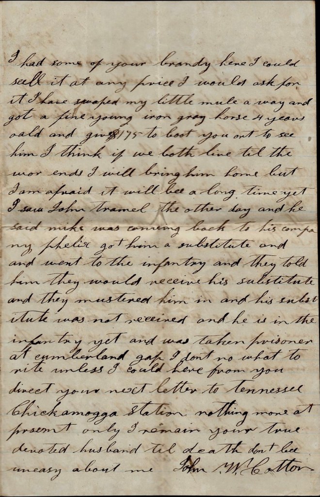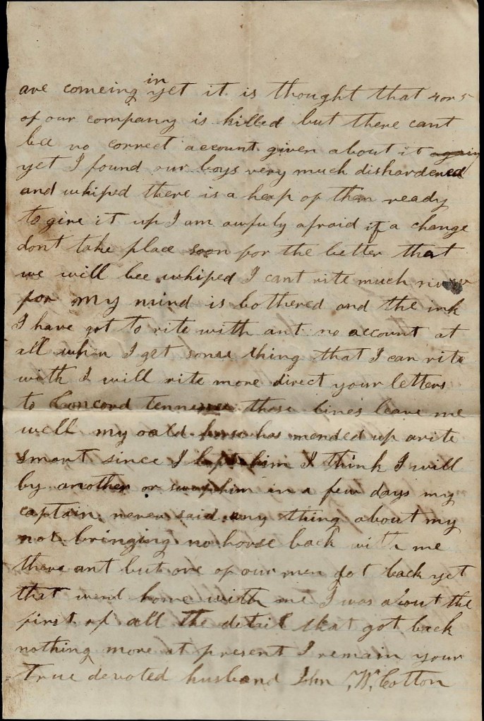 There was a heap of our regiment killed and taken prisoners on their raid into Kentucky. All that got back says they don’t want to go back there anymore. I am glad I weren’t here to go with them. I learn that Mike is gone home. They say Dock went home to get a discharge. General Buckner won’t receive no more substitutes. I hope when you read these few lines, you may be well and better satisfied than you were when I left you. I hope I will hear from you in a few days. This is twice that I have wrote since I got back. I han’t bought me nary horse yet. I reckon we will draw money today. Nothing more at present. Only remain your true, devoted husband till death, — John W. Cotton