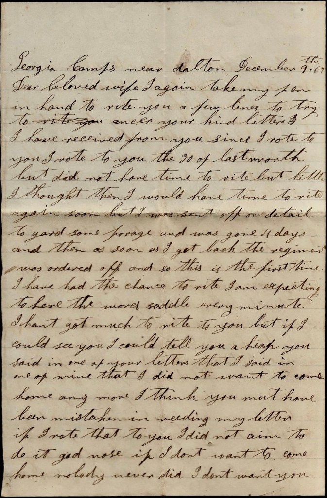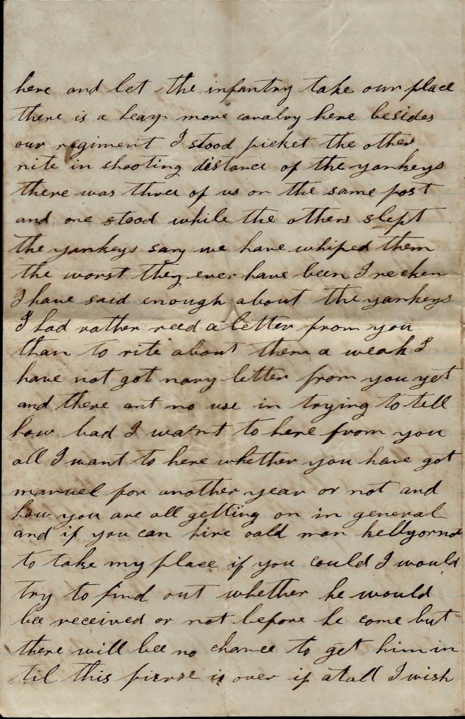 The boys is all well. I will send this by one of my regiment. There is several of the regiment got detailed to go home after horses. I can’t write but little but I think if I could get a letter from you, I think I could write a heap more. I would love to see and know how you all are getting on and I would love to know what the people thinks about the war. We hear that Tennessee has gone back into the Union and Georgia is trying to go back too.