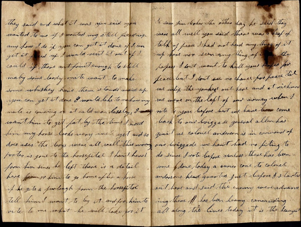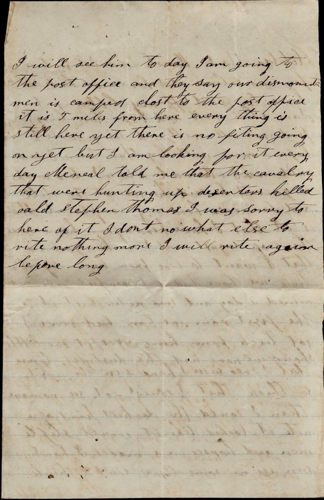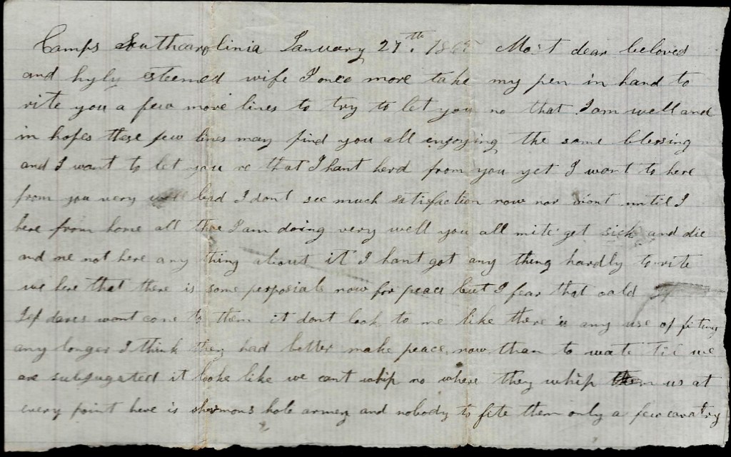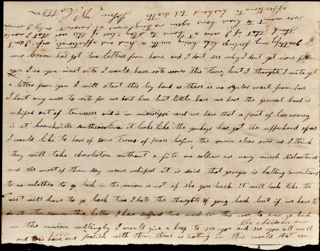 I hant got anything hardly to write. We hear that there is some proposals now for peace but I fear that Old Jeff Davis won’t come to them. It don’t look to me like there is any use of fighting any longer. I think they had better make peace now than to wait till we are subjugated. It looks like we can’t whip no where. They whip us at every point. Here is Sherman’s whole army and nobody to fight them—only a few cavalry ad a few militia, and it takes the cavalry all the time to watch th movements of the army.
