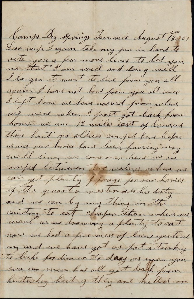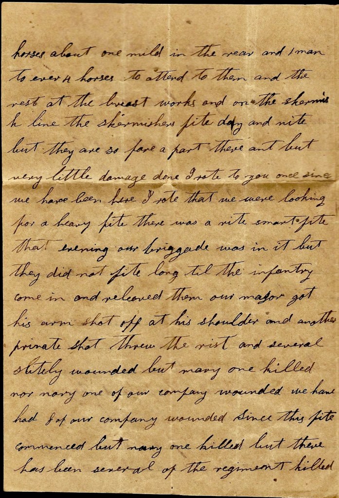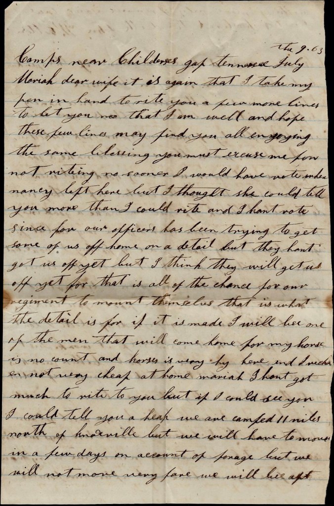 I have not been with the regiment for several days till this morning. I have been detailed to drive some old horses and there is only a few of us here. There is some of us here and some back with the Brigade and some that is dismounted at town two miles from here. I don’t think there is any danger of my being into a fight yet awhile for our regiment is so badly scattered that I don’t think it will be put into a fight till it gets together. I don’t want you to be uneasy about me but take good care of yourself and the children.