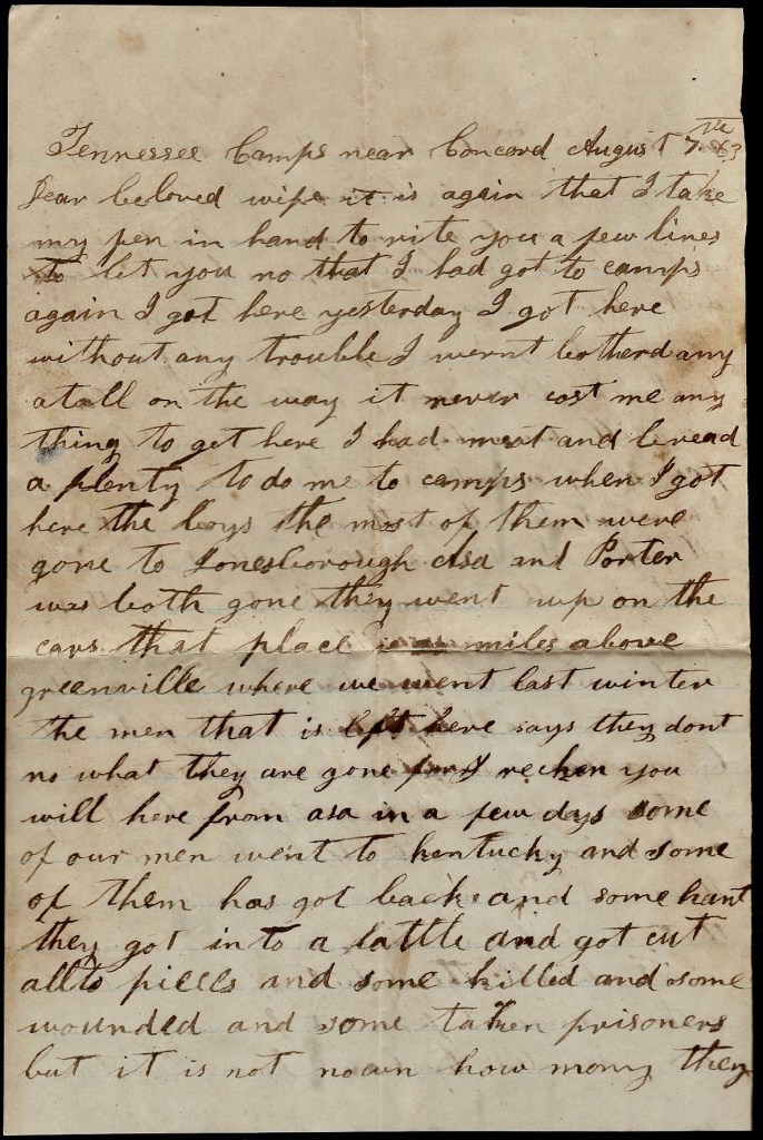 It is again that I take my pen in hand to let you know that I got back to camps again. I got here yesterday. I got here without any trouble. I weren’t bothered any atall on the way. It never cost me anything to get here. I had meat and bread a plenty to do me to camps. When I got here the boys—most of them—were gone to Jonesborough. Asa and Porter were both gone. They went up on the cars. That place is 20 miles above Greenville where we went last winter. The men that is left here says they don’t know what they are gone for. I reckon you will hear from Asa in a few days. Some of our men went to Kentucky and some of them has got back and some hant. They got into a battle and got cut all to pieces and some killed and some wounded and some taken prisoners but it is not known how many. They are coming in yet. It is though that 4 or 5 of our company is killed but there can’t be no correct account given about it yet.
