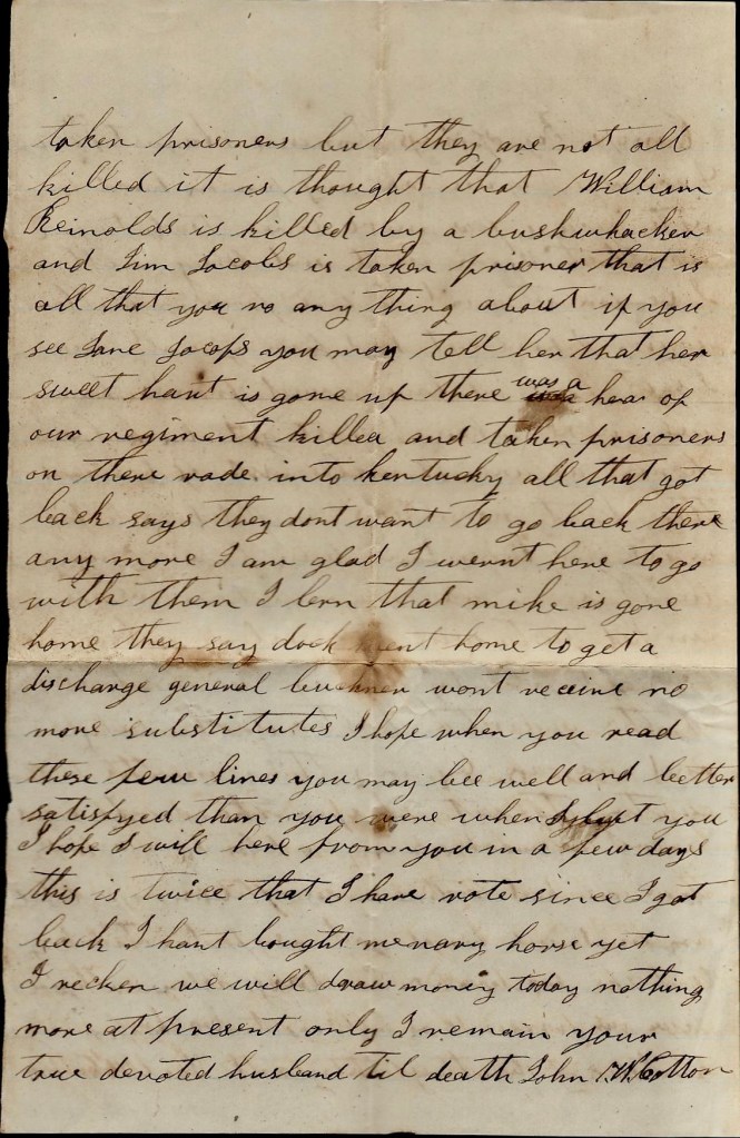 Our men has all got back from Kentucky but nine. They are killed or taken prisoners but they are not all killed. It is though that William Reynolds is killed by a bushwhacker and Jim Jacobs is taken prisoner. That is all that you know anything about. If you see Jane Jacobs, you may tell her that her sweetheart is gone up [North].