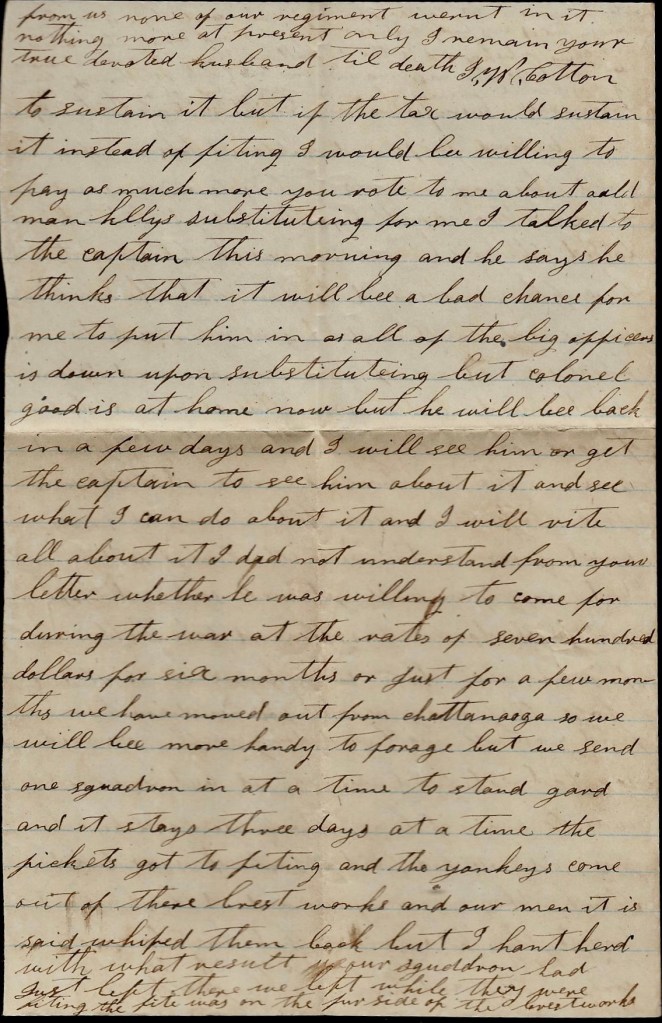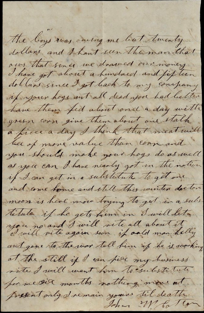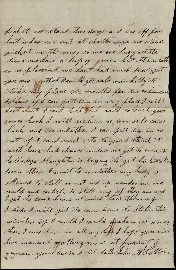 I have nearly got in the notion if I can get a substitute to get one and come home and still this winter. Doctor Moon is here now trying to get in a substitute. If he gets him in, I will let you know and I will write all about it. I will write again soon. If Old Man Kelly ain’t gone to the war, tell him if he is working at the still if I can fix my business right, I will want him to substitute for me six months. Nothing more at present—only I remain yours till death, — John W. Cotton